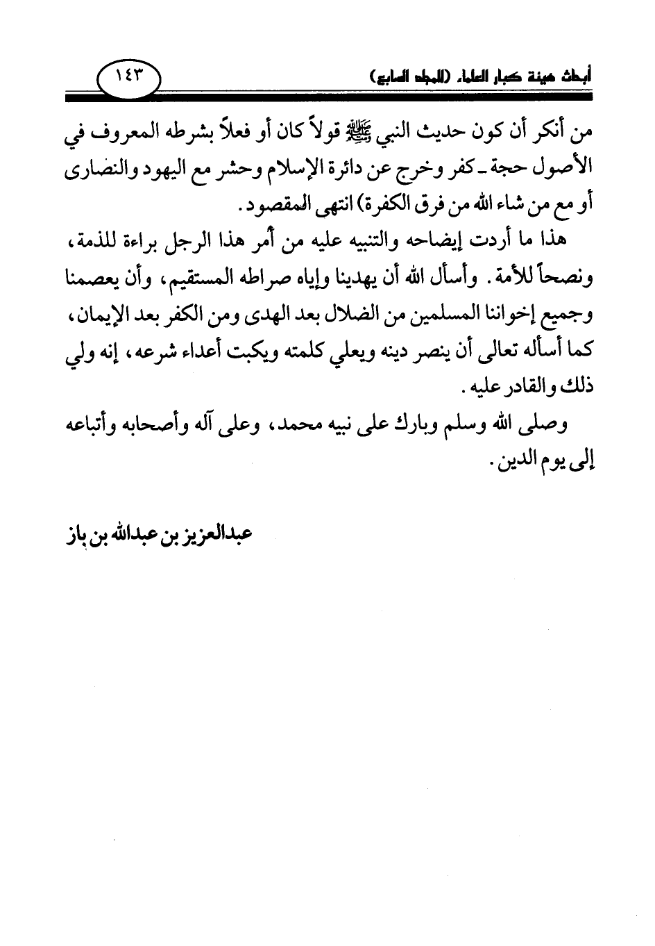 هذا ما أردت إيضاحه والتنبيه عليه من أمر هذا الرجل براءة للذمة، ونصحا للأمة. وأسأل الله أن يهدينا وإياه صراطه المستقيم، وأن يعصمنا وجميع إخواننا المسلمين من الضلال بعد الهدى ومن الكفر بعد الإيمان، كما أسأله تعالى أن ينصر دينه ويعلي كلمته ويكبت أعداء شرعه، إنه ولي ذلك والقادر عليه.