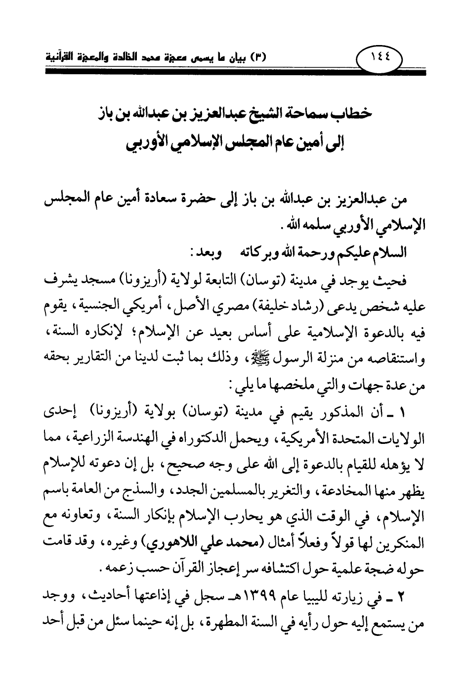 خطاب سماحة الشيخ عبد العزيز بن عبد الله بن باز إلى أمين عام المجلس الإسلامي الأوربي