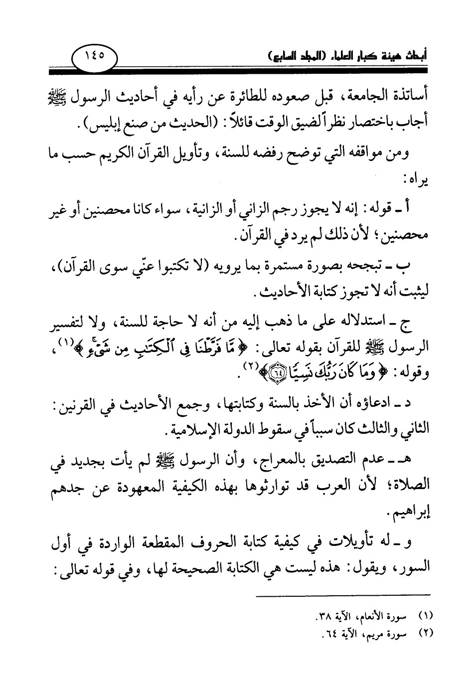 ج- استدلاله على ما ذهب إليه من أنه لا حاجة للسنة، ولا لتفسير الرسول صلى الله عليه وسلم للقرآن بقوله تعالى: {مَا فَرَّطْنَا فِي الْكِتَابِ مِنْ شَيْءٍ} (¬1) وقوله: {وَمَا كَانَ رَبُّكَ نَسِيًّا} (¬2)