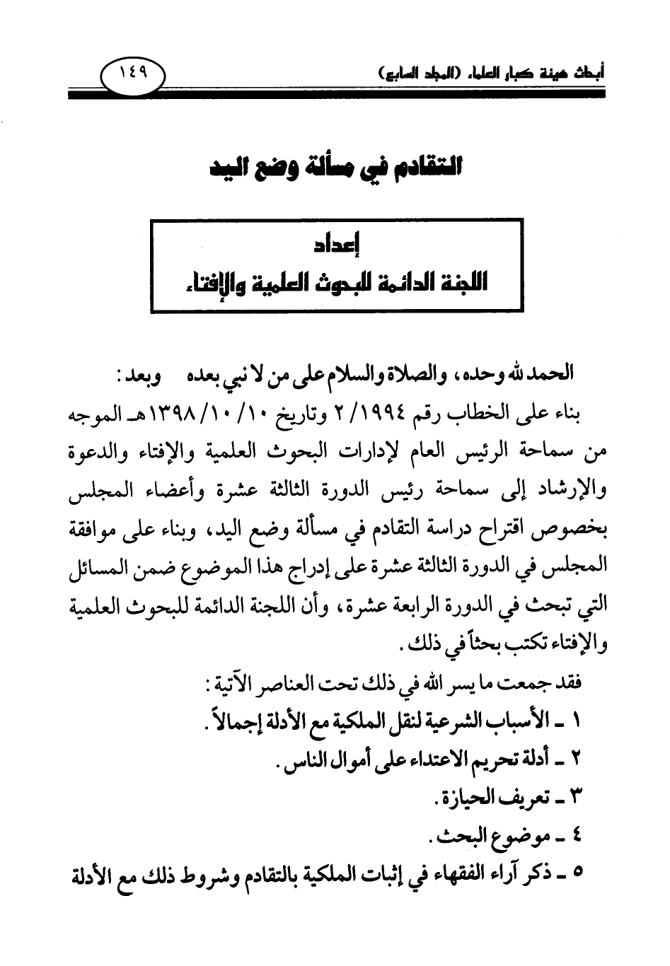 بناء على الخطاب رقم 1994\ 2 وتاريخ 10\ 10\ 1398 هـ الموجه من سماحة الرئيس العام لإدارات البحوث العلمية والإفتاء والدعوة والإرشاد إلى سماحة رئيس الدورة الثالثة عشرة وأعضاء المجلس بخصوص اقتراح دراسة التقادم في مسألة وضع اليد، وبناء على موافقة المجلس في الدورة الثالثة عشرة على إدراج هذا الموضوع ضمن المسائل التي تبحث في الدورة الرابعة عشرة، وأن اللجنة الدائمة للبحوث العلمية والإفتاء تكتب بحثا في ذلك.