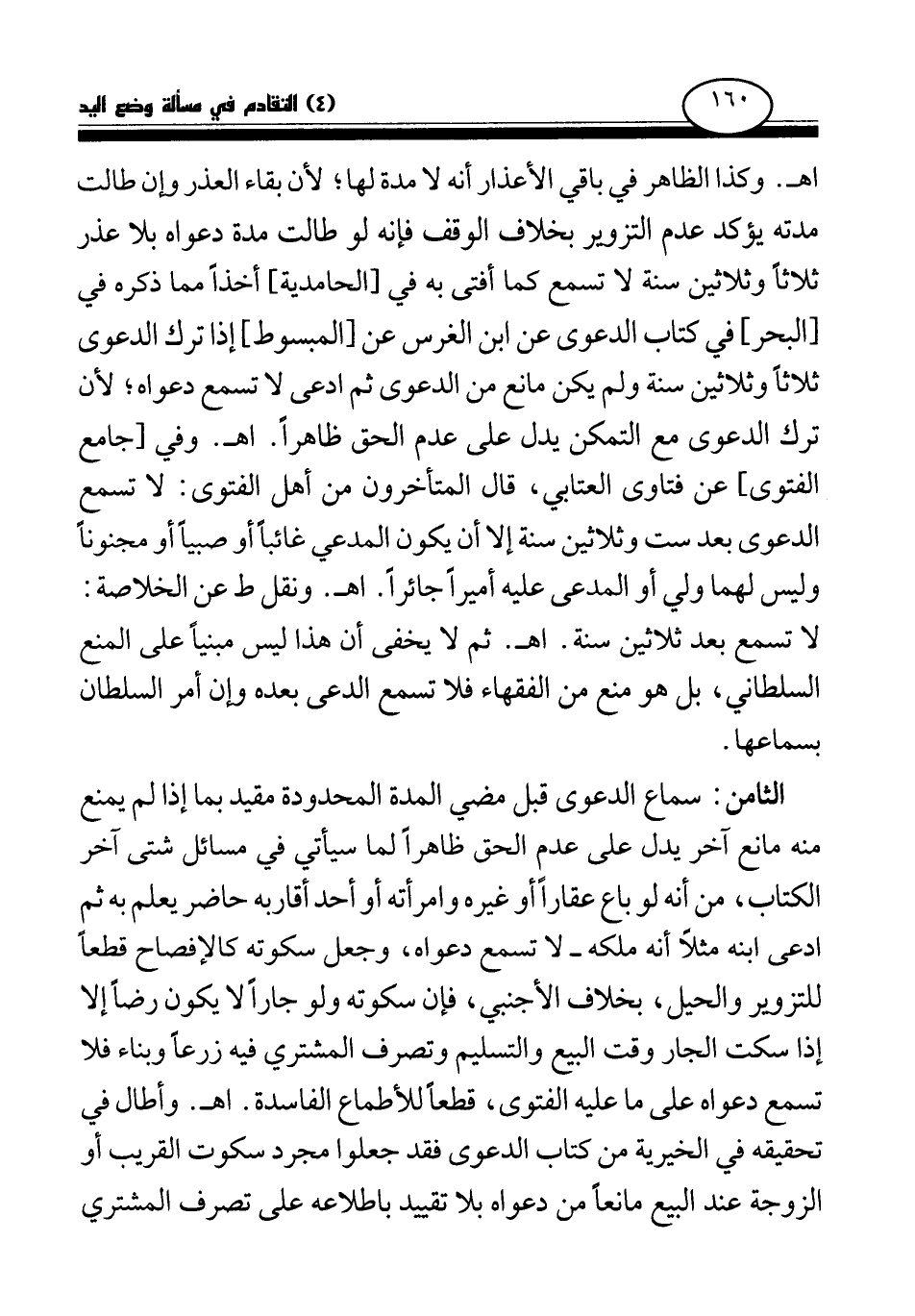 الثامن: سماع الدعوى قبل مضي المدة المحدودة مقيد بما إذا لم يمنع منه مانع آخر يدل على عدم الحق ظاهرا لما سيأتي في مسائل شتى آخر الكتاب، من أنه لو باع عقارا أو غيره وامرأته أو أحد أقاربه حاضر يعلم به ثم ادعى ابنه مثلا أنه ملكه - لا تسمع دعواه، وجعل سكوته كالإفصاح قطعا للتزوير والحيل، بخلاف الأجنبي، فإن سكوته ولو جارا لا يكون رضا إلا إذا سكت الجار وقت البيع والتسليم وتصرف المشتري فيه زرعا وبناء فلا تسمع دعواه على ما عليه الفتوى، قطعا للأطماع الفاسدة. اهـ. وأطال في تحقيقه في الخيرية من كتاب الدعوى فقد جعلوا مجرد سكوت القريب أو الزوجة عند البيع مانعا من دعواه بلا تقييد باطلاعه على تصرف المشتري