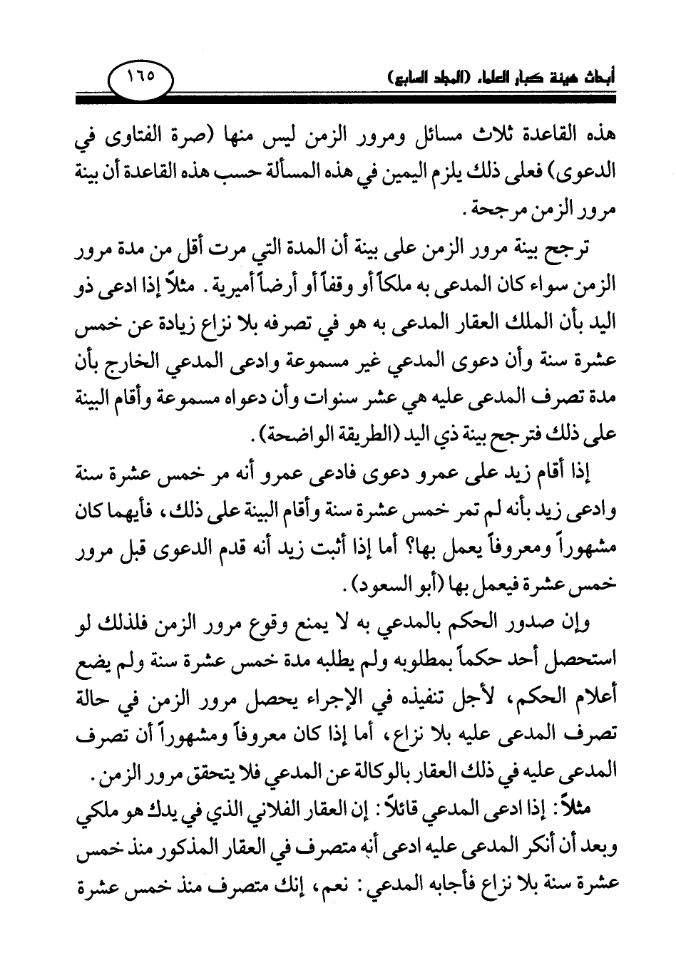 إذا أقام زيد على عمرو دعوى فادعى عمرو أنه مر خمس عشرة سنة وادعى زيد بأنه لم تمر خمس عشرة سنة وأقام البينة على ذلك، فأيهما كان مشهورا ومعروفا يعمل بها؟ أما إذا أثبت زيد أنه قدم الدعوى قبل مرور خمس عشرة فيعمل بها (أبو السعود) .
