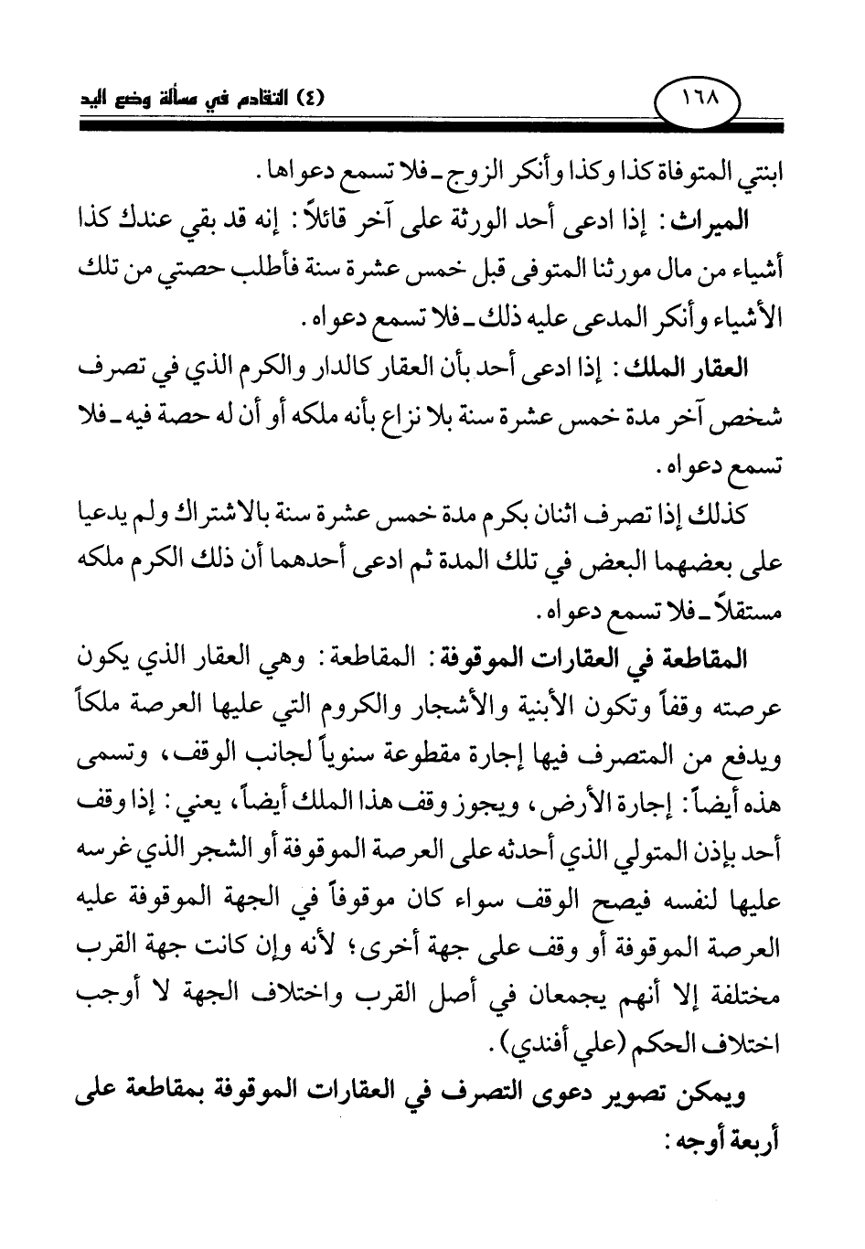 العقار الملك: إذا ادعى أحد بأن العقار كالدار والكرم الذي في تصرف شخص آخر مدة خمس عشرة سنة بلا نزاع بأنه ملكه أو أن له حصة فيه - فلا تسمع دعواه.