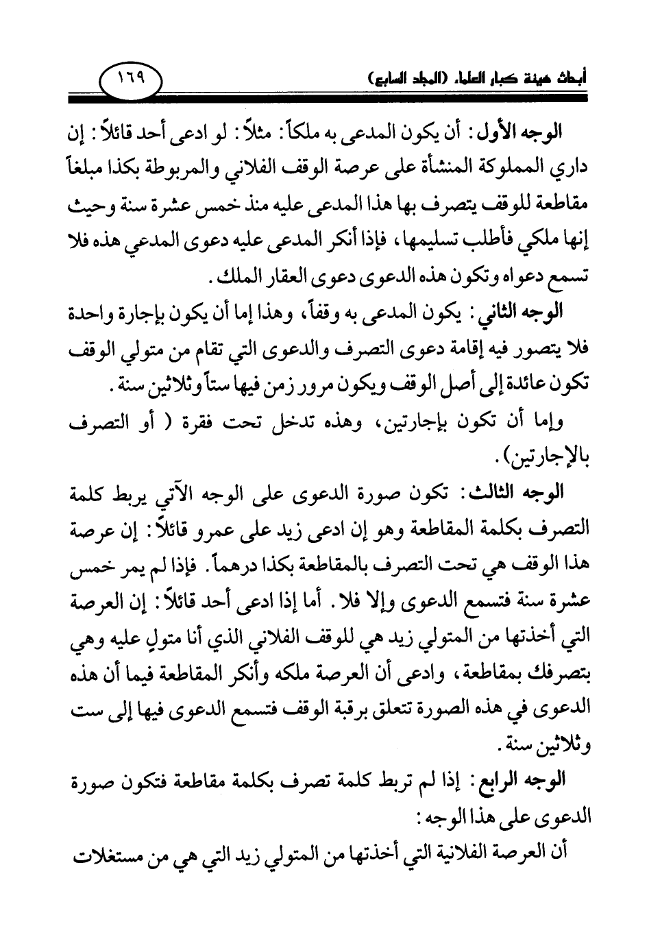 الوجه الثالث: تكون صورة الدعوى على الوجه الآتي يربط كلمة التصرف بكلمة المقاطعة وهو إن ادعى زيد على عمرو قائلا: إن عرصة هذا الوقف هي تحت التصرف بالمقاطعة بكذا درهما. فإذا لم يمر خمس عشرة سنة فتسمع الدعوى وإلا فلا. أما إذا ادعى أحد قائلا: إن العرصة التي أخذتها من المتولي زيد هي للوقف الفلاني الذي أنا متول عليه وهي بتصرفك بمقاطعة، وادعى أن العرصة ملكه وأنكر المقاطعة فيما أن هذه الدعوى في هذه الصورة تتعلق برقبة الوقف فتسمع الدعوى فيها إلى ست وثلاثين سنة.