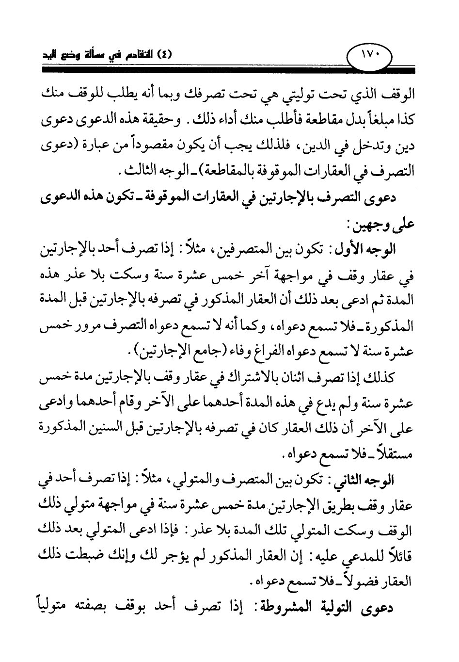 الوجه الأول: تكون بين المتصرفين، مثلا: إذا تصرف أحد بالإجارتين في عقار وقف في مواجهة آخر خمس عشرة سنة وسكت بلا عذر هذه المدة ثم ادعى بعد ذلك أن العقار المذكور في تصرفه بالإجارتين قبل المدة المذكورة - فلا تسمع دعواه، وكما أنه لا تسمع دعواه التصرف مرور خمس عشرة سنة لا تسمع دعواه الفراغ وفاء (جامع الإجارتين) .