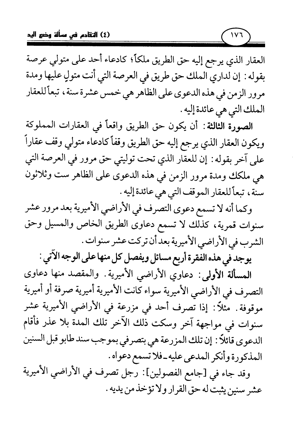 الصورة الثالثة: أن يكون حق الطريق واقعا في العقارات المملوكة ويكون العقار الذي يرجع إليه حق الطريق وقفا كادعاء متولي وقف عقارا على آخر بقوله: إن للعقار الذي تحت توليتي حق مرور في العرصة التي هي ملكك ومدة مرور الزمن في هذه الدعوى على الظاهر ست وثلاثون سنة، تبعا للعقار الموقف التي هي عائدة إليه.