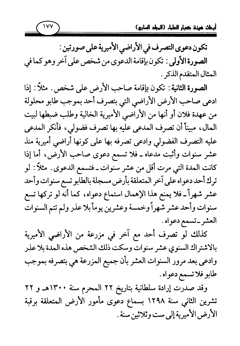 وقد صدرت إرادة سلطانية بتاريخ 22 المحرم سنة 1300هـ و 22 تشرين الثاني سنة 1298 بسماع دعوى مأمور الأرض المتعلقة برقبة الأرض الأميرية إلى ست وثلاثين سنة.