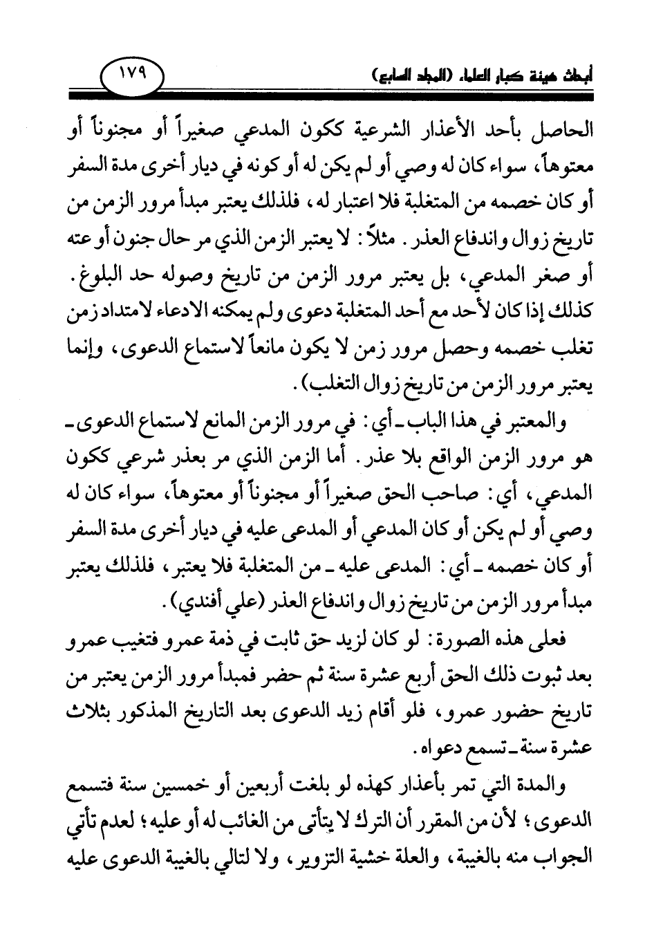والمعتبر في هذا الباب - أي: في مرور الزمن المانع لاستماع الدعوى - هو مرور الزمن الواقع بلا عذر. أما الزمن الذي مر بعذر شرعي ككون المدعي، أي: صاحب الحق صغيرا أو مجنونا أو معتوها، سواء كان له وصي أو لم يكن أو كان المدعي أو المدعى عليه في ديار أخرى مدة السفر أو كان خصمه - أي: المدعى عليه - من المتغلبة فلا يعتبر، فلذلك يعتبر مبدأ مرور الزمن من تاريخ زوال واندفاع العذر (علي أفندي) .