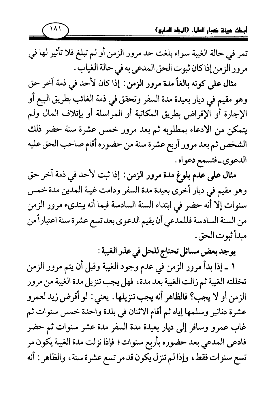 1 - إذا بدأ مرور الزمن في عدم وجود الغيبة وقبل أن يتم مرور الزمن تخللته الغيبة ثم زالت الغيبة بعد مدة، فهل يجب تنزيل مدة الغيبة من مرور الزمن أو لا يجب؟ فالظاهر أنه يجب تنزيلها. يعني: لو أقرض زيد لعمرو عشرة دنانير وسلمها إياه ثم أقام الاثنان في بلدة واحدة خمس سنوات ثم غاب عمرو وسافر إلى ديار بعيدة مدة السفر مدة عشر سنوات ثم حضر فادعى المدعي بعد حضوره بأربع سنوات؛ فإذا نزلت مدة الغيبة يكون مر تسع سنوات فقط، وإذا لم تنزل يكون قد مر تسع عشرة سنة، والظاهر: أنه