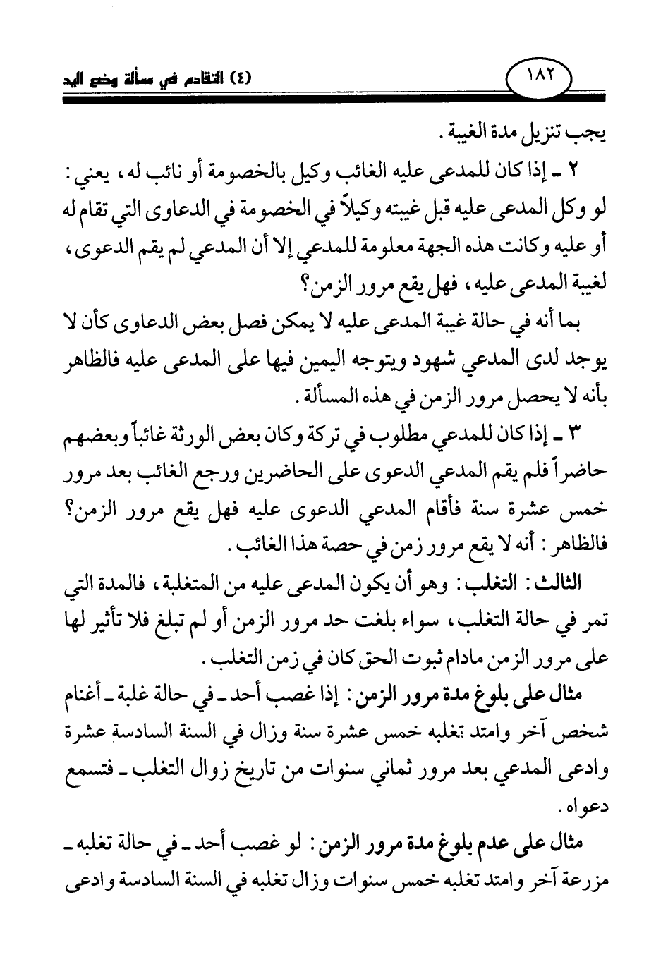 3 - إذا كان للمدعي مطلوب في تركة وكان بعض الورثة غائبا وبعضهم حاضرا فلم يقم المدعي الدعوى على الحاضرين ورجع الغائب بعد مرور خمس عشرة سنة فأقام المدعي الدعوى عليه فهل يقع مرور الزمن؟ فالظاهر: أنه لا يقع مرور زمن في حصة هذا الغائب.