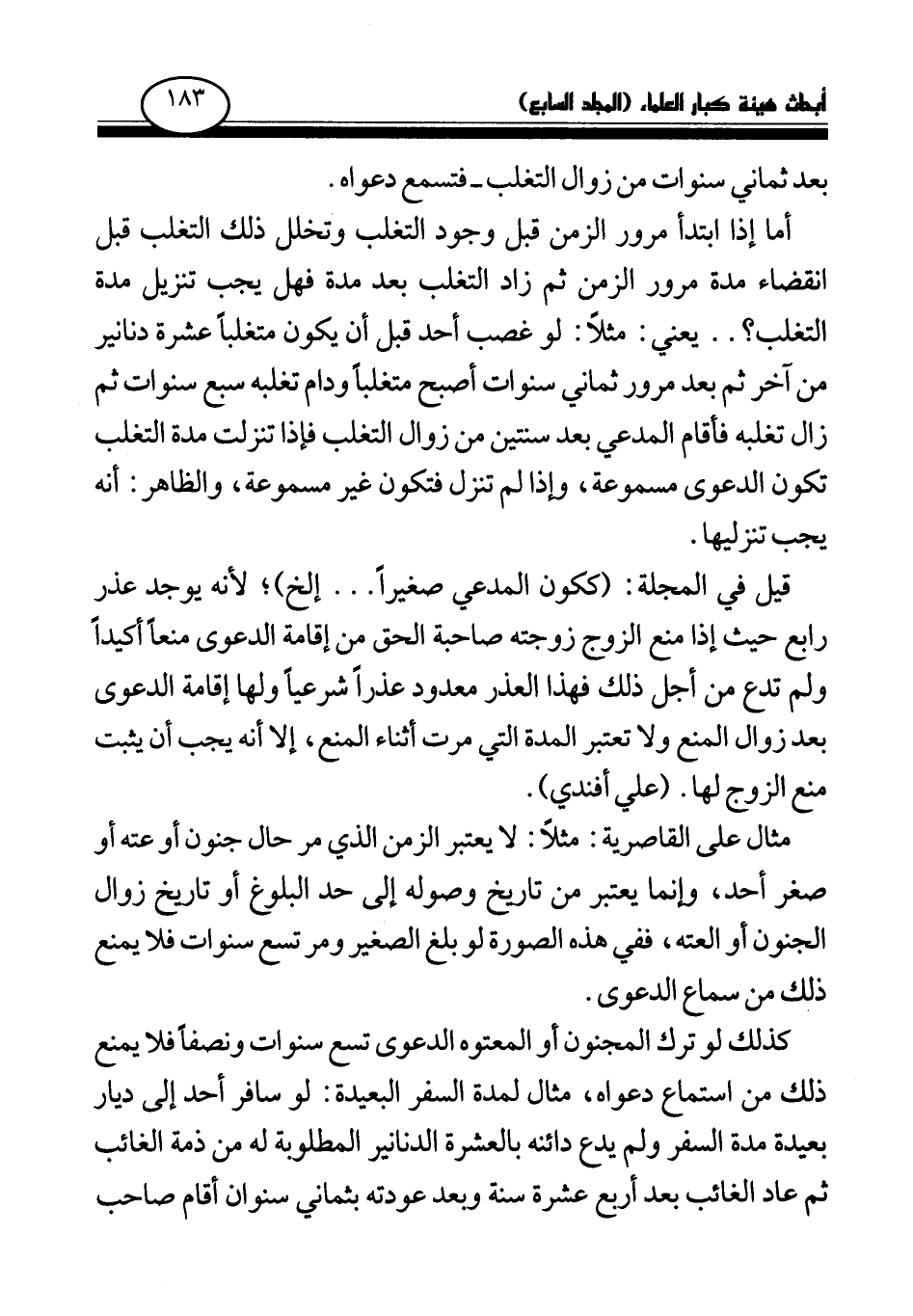 كذلك لو ترك المجنون أو المعتوه الدعوى تسع سنوات ونصفا فلا يمنع ذلك من استماع دعواه، مثال لمدة السفر البعيدة: لو سافر أحد إلى ديار بعيدة مدة السفر ولم يدع دائنه بالعشرة الدنانير المطلوبة له من ذمة الغائب ثم عاد الغائب بعد أربع عشرة سنة وبعد عودته بثماني سنوات أقام صاحب