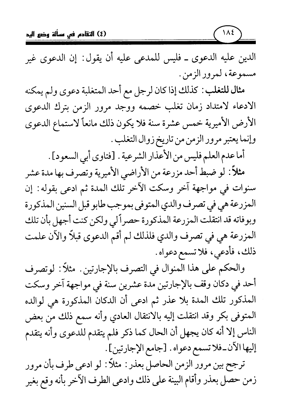 والحكم على هذا المنوال في التصرف بالإجارتين. مثلا: لو تصرف أحد في دكان وقف بالإجارتين مدة عشرين سنة في مواجهة آخر وسكت المذكور تلك المدة بلا عذر ثم ادعى أن الدكان المذكورة هي لوالده المتوفى بكر وقد انتقلت إليه بالانتقال العادي وأنه سمع ذلك من بعض الناس إلا أنه كان يجهل أن الحال كما ذكر فلم يتقدم للدعوى وأنه يتقدم إليها الآن - فلا تسمع دعواه. [جامع الإجارتين] .