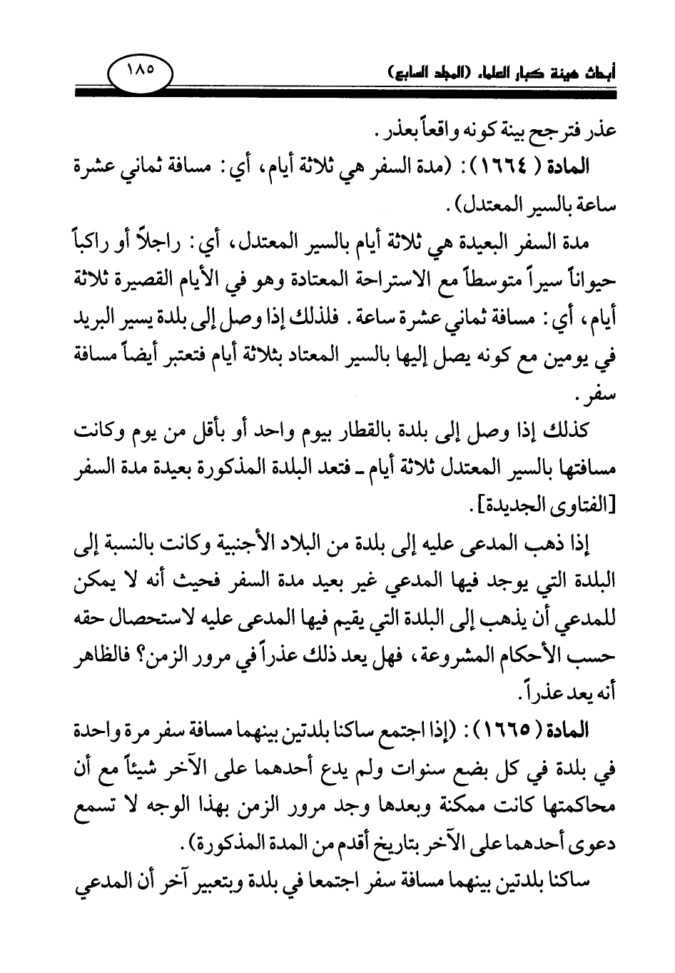 المادة (1664) : (مدة السفر هي ثلاثة أيام، أي: مسافة ثماني عشرة ساعة بالسير المعتدل) .