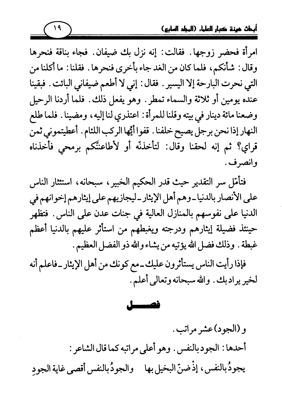 امرأة فحضر زوجها. فقالت: إنه نزل بك ضيفان. فجاء بناقة فنحرها وقال: شأنكم، فلما كان من الغد جاء بأخرى فنحرها. فقلنا: ما أكلنا من التي نحرت البارحة إلا اليسير. فقال: إني لا أطعم ضيفاني البائت. فبقينا عنده يومين أو ثلاثة والسماء تمطر. وهو يفعل ذلك. فلما أردنا الرحيل وضعنا مائة دينار في بيته وقلنا للمرأة: اعتذري لنا إليه، ومضينا. فلما طلع النهار إذا نحن برجل يصيح خلفنا. قفوا أيها الركب اللئام. أعطيتموني ثمن قراي؟ ثم إنه لحقنا وقال: لتأخذنه أو لأطاعننكم برمحي فأخذناه وانصرف.