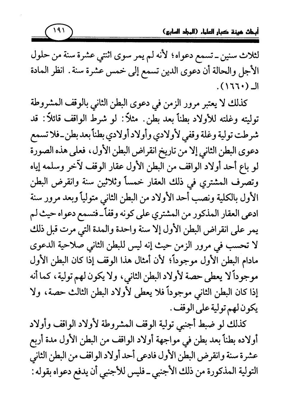 كذلك لا يعتبر مرور الزمن في دعوى البطن الثاني بالوقف المشروطة توليته وغلته للأولاد بطنا بعد بطن. مثلا: لو شرط الواقف قائلا: قد شرطت تولية وغلة وقفي لأولادي وأولاد أولادي بطنا بعد بطن - فلا تسمع دعوى البطن الثاني إلا من تاريخ انقراض البطن الأول، فعلى هذه الصورة لو باع أحد أولاد الواقف من البطن الأول عقار الوقف لآخر وسلمه إياه وتصرف المشتري في ذلك العقار خمسا وثلاثين سنة وانقرض البطن الأول بالكلية ونصب أحد الأولاد من البطن الثاني متوليا وبعد مرور سنة ادعى العقار المذكور من المشتري على كونه وقفا - فتسمع دعواه حيث لم يمر على انقراض البطن الأول إلا سنة واحدة والمدة التي مرت قبل ذلك لا تحسب في مرور الزمن حيث إنه ليس للبطن الثاني صلاحية الدعوى ما دام البطن الأول موجودا؛ لأن أمثال هذا الوقف إذا كان البطن الأول موجودا لا يعطى حصة لأولاد البطن الثاني، ولا يكون لهم تولية، كما أنه إذا كان البطن الثاني موجودا فلا يعطى لأولاد البطن الثالث حصة، ولا يكون لهم تولية على الوقف.