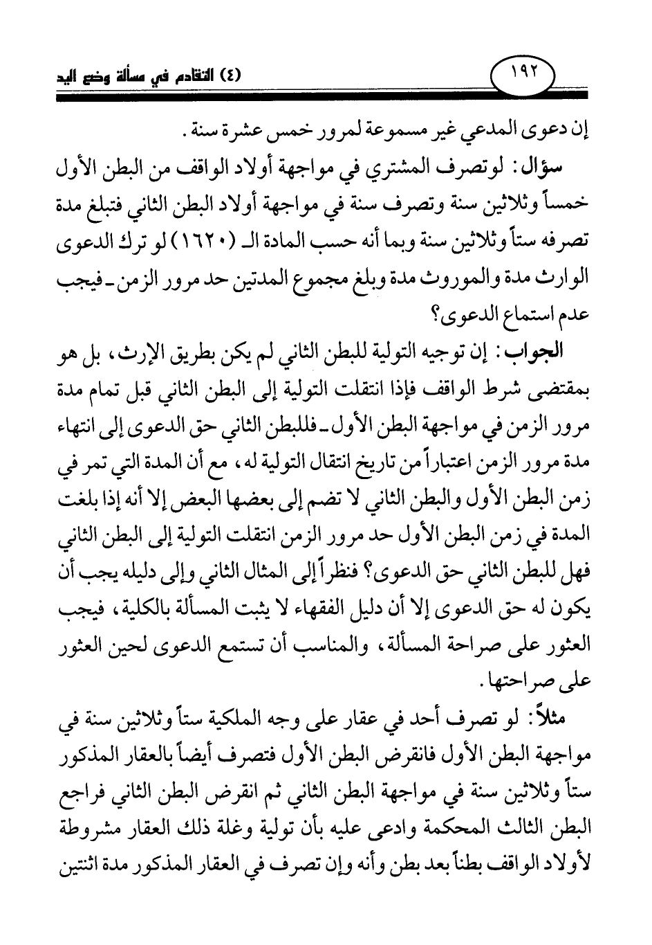 الجواب: إن توجيه التولية للبطن الثاني لم يكن بطريق الإرث، بل هو بمقتضى شرط الواقف فإذا انتقلت التولية إلى البطن الثاني قبل تمام مدة مرور الزمن في مواجهة البطن الأول - فللبطن الثاني حق الدعوى إلى انتهاء مدة مرور الزمن اعتبارا من تاريخ انتقال التولية له، مع أن المدة التي تمر في زمن البطن الأول والبطن الثاني لا تضم إلى بعضها البعض إلا أنه إذا بلغت المدة في زمن البطن الأول حد مرور الزمن انتقلت التولية إلى البطن الثاني فهل للبطن الثاني حق الدعوى؟ فنظرا إلى المثال الثاني وإلى دليله يجب أن يكون له حق الدعوى إلا أن دليل الفقهاء لا يثبت المسألة بالكلية، فيجب العثور على صراحة المسألة، والمناسب أن تستمع الدعوى لحين العثور على صراحتها.