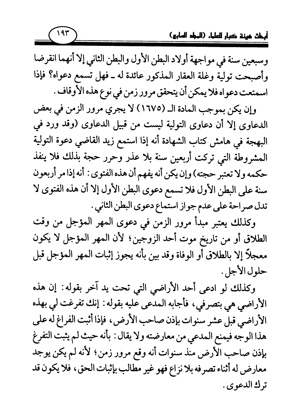 وإن يكن بموجب المادة الـ (1675) لا يجري مرور الزمن في بعض الدعاوى إلا أن دعاوى التولية ليست من قبيل الدعاوى (وقد ورد في البهجة في هامش كتاب الشهادة أنه إذا استمع زيد القاضي دعوة التولية المشروطة التي تركت أربعين سنة بلا عذر وحرر حجة بذلك فلا ينفذ حكمه ولا تعتبر حجته) وإن يكن أنه يفهم أن هذه الفتوى: أنه إذا مر أربعون سنة على البطن الأول فلا تسمع دعوى البطن الأول إلا أن هذه الفتوى لا تدل صراحة على عدم جواز استماع دعوى البطن الثاني.