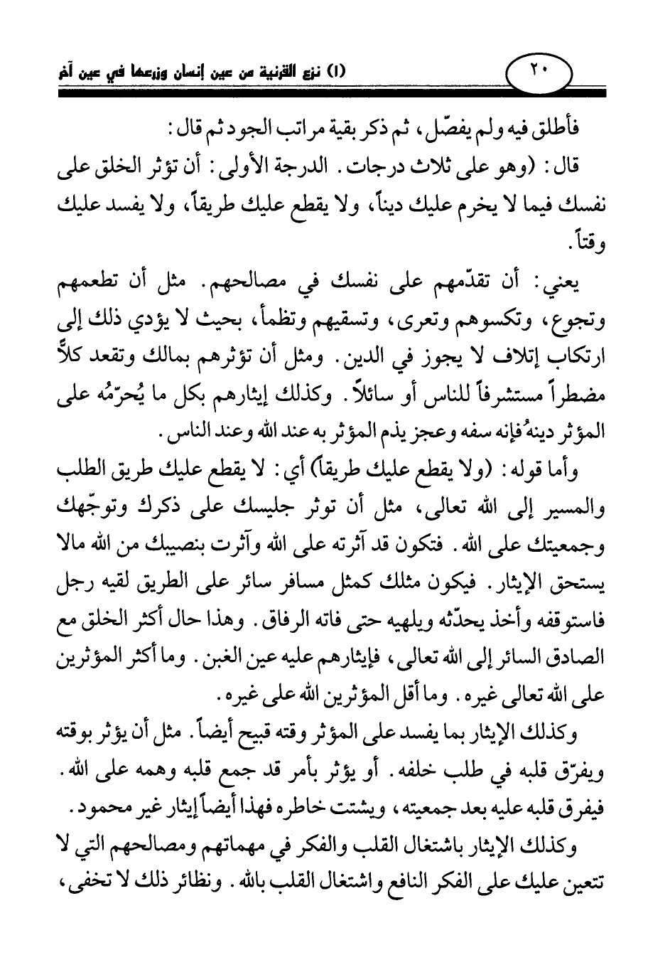 ثم ذكر بقية مراتب الجود ثم قال: قال: (وهو على ثلاث درجات. الدرجة الأولى: أن تؤثر الخلق على نفسك فيما لا يخرم عليك دينا، ولا يقطع عليك طريقا، ولا يفسد عليك وقتا.