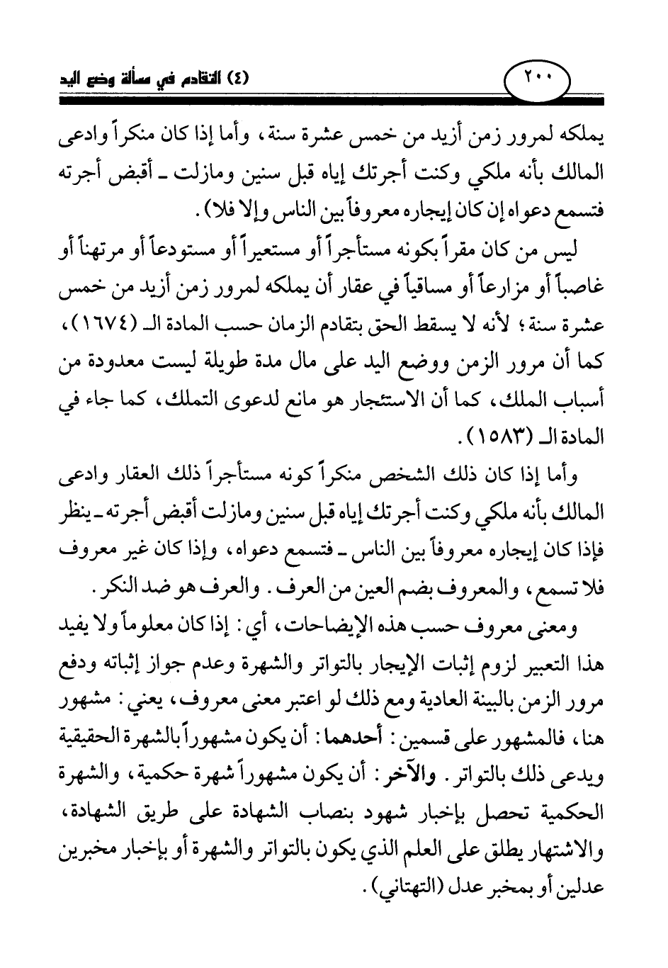 ومعنى معروف حسب هذه الإيضاحات، أي: إذا كان معلوما ولا يفيد هذا التعبير لزوم إثبات الإيجار بالتواتر والشهرة وعدم جواز إثباته ودفع مرور الزمن بالبينة العادية ومع ذلك لو اعتبر معنى معروف، يعني: مشهور هنا، فالمشهور على قسمين: أحدهما: أن يكون مشهورا بالشهرة الحقيقية ويدعى ذلك بالتواتر. والآخر: أن يكون مشهورا شهرة حكمية، والشهرة الحكمية تحصل بإخبار شهود بنصاب الشهادة على طريق الشهادة، والاشتهار يطلق على العلم الذي يكون بالتواتر والشهرة أو بإخبار مخبرين عدلين أو بمخبر عدل (التهتاني) .