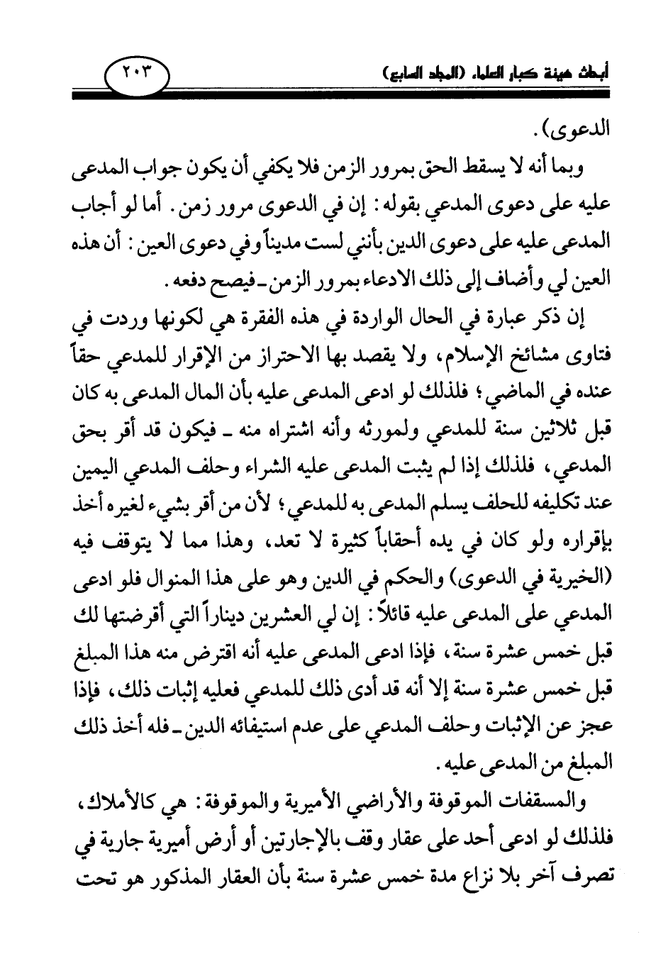 إن ذكر عبارة في الحال الواردة في هذه الفقرة هي لكونها وردت في فتاوى مشائخ الإسلام، ولا يقصد بها الاحتراز من الإقرار للمدعي حقا عنده في الماضي؛ فلذلك لو ادعى المدعى عليه بأن المال المدعى به كان قبل ثلاثين سنة للمدعي ولمورثه وأنه اشتراه منه -فيكون قد أقر بحق المدعي، فلذلك إذا لم يثبت المدعى عليه الشراء وحلف المدعي اليمين عند تكليفه للحلف يسلم المدعى به للمدعي؛ لأن من أقر بشيء لغيره أخذ بإقراره ولو كان في يده أحقابا كثيرة لا تعد، وهذا مما لا يتوقف فيه (الخيرية في الدعوى) والحكم في الدين وهو على هذا المنوال فلو ادعى المدعي على المدعى عليه قائلا: إن لي العشرين دينارا التي أقرضتها لك قبل خمس عشرة سنة، فإذا ادعى المدعى عليه أنه اقترض منه هذا المبلغ قبل خمس عشرة سنة إلا أنه قد أدى ذلك للمدعي فعليه إثبات ذلك، فإذا عجز عن الإثبات وحلف المدعي على عدم استيفائه الدين -فله أخذ ذلك المبلغ من المدعى عليه.