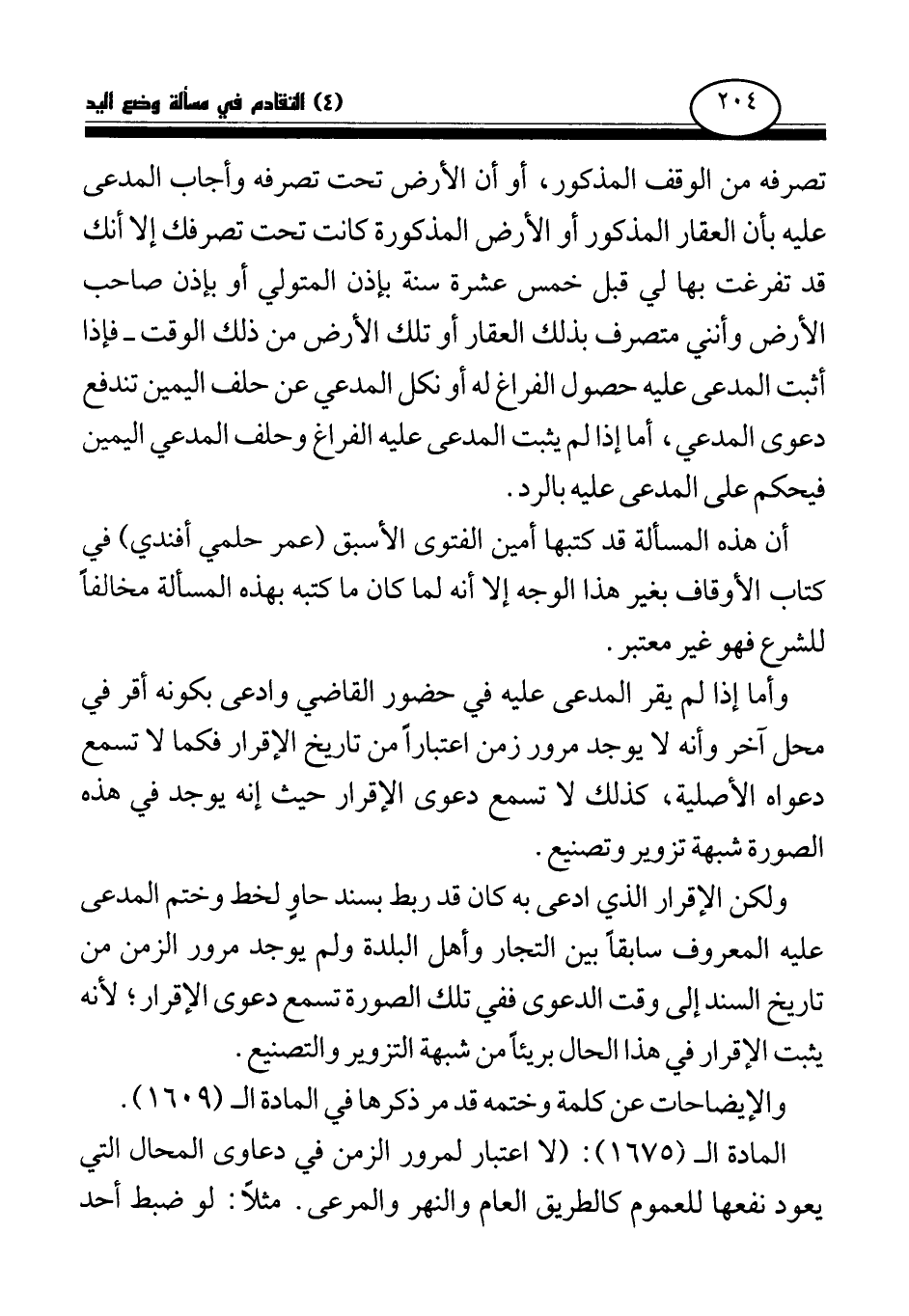 المادة الـ (1675) : (لا اعتبار لمرور الزمن في دعاوى المحال التي يعود نفعها للعموم كالطريق العام والنهر والمرعى. مثلا: لو ضبط أحد