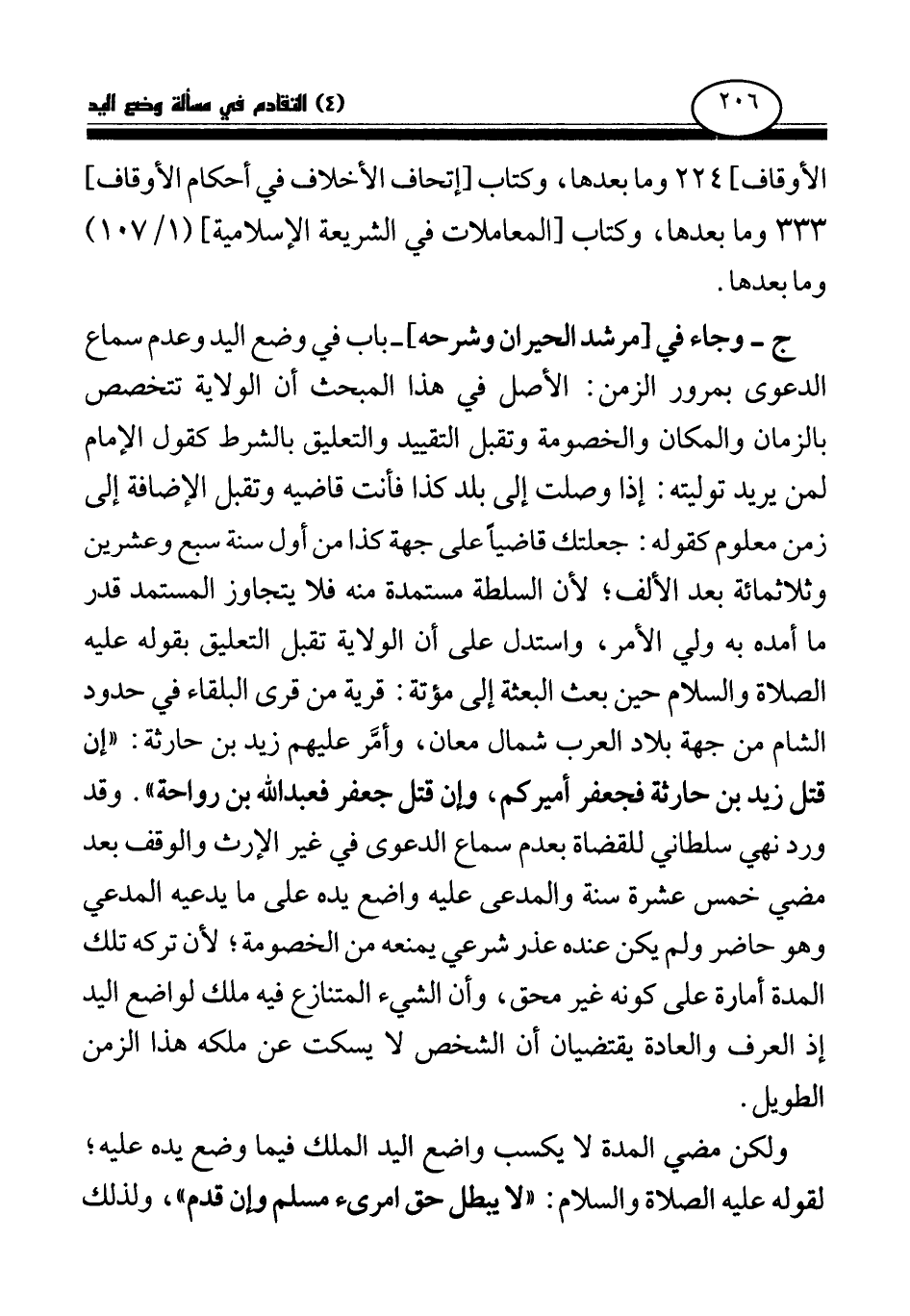 ج- وجاء في [مرشد الحيران وشرحه] باب في وضع اليد وعدم سماع الدعوى بمرور الزمن: الأصل في هذا المبحث أن الولاية تتخصص بالزمان والمكان والخصومة وتقبل التقييد والتعليق بالشرط كقول الإمام لمن يريد توليته: إذا وصلت إلى بلد كذا فأنت قاضيه وتقبل الإضافة إلى زمن معلوم كقوله: جعلتك قاضيا على جهة كذا من أول سنة سبع وعشرين وثلاثمائة بعد الألف؛ لأن السلطة مستمدة منه فلا يتجاوز المستمد قدر ما أمده به ولي الأمر، واستدل على أن الولاية تقبل التعليق بقوله عليه الصلاة والسلام حين بعث البعثة إلى مؤتة: قرية من قرى البلقاء في حدود الشام من جهة بلاد العرب شمال معان، وأمر عليهم زيد بن حارثة: «إن قتل زيد بن حارثة فجعفر أميركم، وإن قتل جعفر فعبد الله بن رواحة (¬1) » .