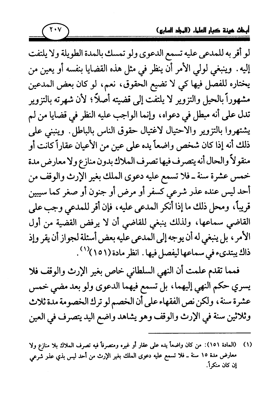 فمما تقدم علمت أن النهي السلطاني خاص بغير الإرث والوقف، فلا يسري حكم النهي إليهما، بل تسمع فيهما الدعوى ولو بعد مضي خمس عشرة سنة، ولكن نص الفقهاء على أن الخصم لو ترك الخصومة مدة ثلاث وثلاثين سنة في الإرث والوقف وهو يشاهد واضع اليد يتصرف في العين