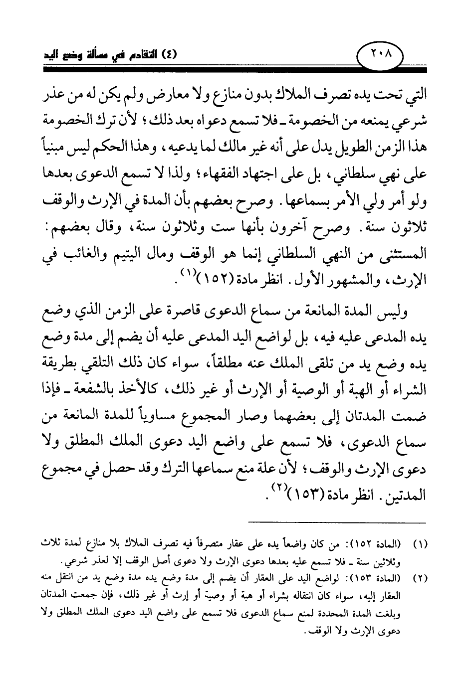 التي تحت يده تصرف الملاك بدون منازع ولا معارض ولم يكن له من عذر شرعي يمنعه من الخصومة - فلا تسمع دعواه بعد ذلك؛ لأن ترك الخصومة هذا الزمن الطويل يدل على أنه غير مالك لما يدعيه، وهذا الحكم ليس مبنيا على نهي سلطاني، بل على اجتهاد الفقهاء؛ ولذا لا تسمع الدعوى بعدها ولو أمر ولي الأمر بسماعها. وصرح بعضهم بأن المدة في الإرث والوقف ثلاثون سنة. وصرح آخرون بأنها ست وثلاثون سنة، وقال بعضهم: المستثنى من النهي السلطاني إنما هو الوقف ومال اليتيم والغائب في الإرث، والمشهور الأول. انظر مادة (152) .