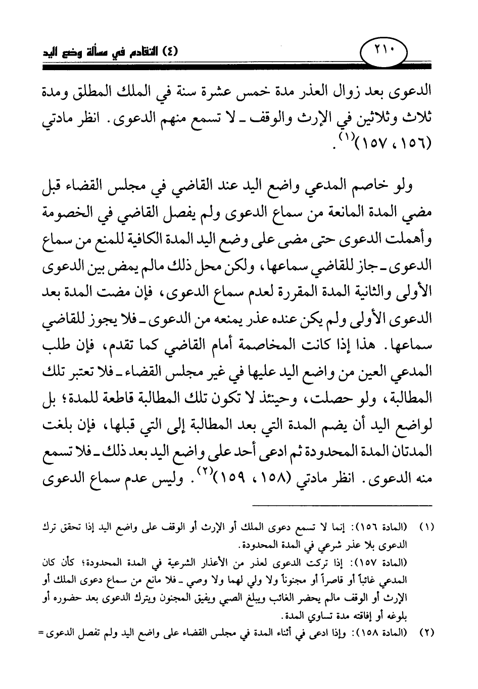 الدعوى بعد زوال العذر مدة خمس عشرة سنة في الملك المطلق ومدة ثلاثا وثلاثين في الإرث والوقف - لا تسمع منهم الدعوى. انظر مادتي (156، 157) .