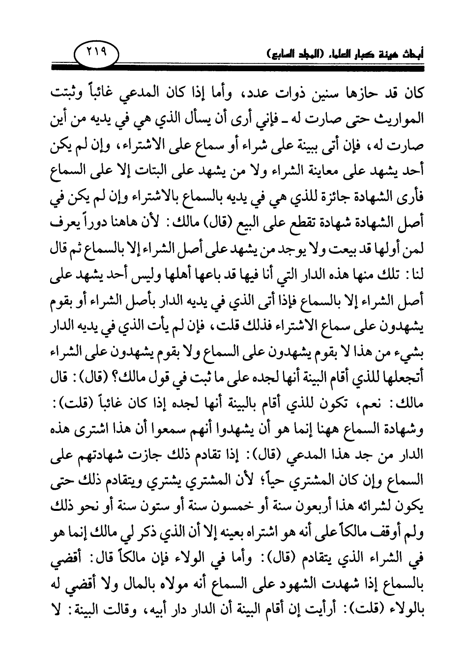 كان قد حازها سنين ذوات عدد، وأما إذا كان المدعي غائبا وثبتت المواريث حتى صارت له -فإني أرى أن يسأل الذي هي في يديه من أين صارت له، فإن أتى ببينة على شراء أو سماع على الاشتراء، وإن لم يكن أحد يشهد على معاينة الشراء ولا من يشهد على البتات إلا على السماع فأرى الشهادة جائزة للذي هي في يديه بالسماع بالاشتراء، وإن لم يكن في أصل الشهادة شهادة تقطع على البيع (قال) مالك: لأن هاهنا دورا يعرف لمن أولها قد بيعت ولا يوجد من يشهد على أصل الشراء إلا بالسماع ثم قال لنا: تلك منها هذه الدار التي أنا فيها قد باعها أهلها وليس أحد يشهد على أصل الشراء إلا بالسماع فإذا أتى الذي في يديه الدار بأصل الشراء أو بقوم يشهدون على سماع الاشتراء فذلك قلت، فإن لم يأت الذي في يديه الدار بشيء من هذا لا بقوم يشهدون على السماع ولا بقوم يشهدون على الشراء أتجعلها للذي أقام البينة أنها لجده على ما ثبت في قول مالك؟ (قال) : قال مالك: نعم، تكون للذي أقام بالبينة أنها لجده إذا كان غائبا (قلت) : وشهادة السماع هاهنا إنما هو أن يشهدوا أنهم سمعوا أن هذا اشترى هذه الدار من جد هذا المدعي (قال) : إذا تقادم ذلك جازت شهادتهم على السماع وإن كان المشتري حيا؛ لأن المشتري يشتري ويتقادم ذلك حتى يكون لشرائه هذا أربعون سنة أو خمسون سنة أو ستون سنة أو نحو ذلك ولم أوقف مالكا على أنه هو اشتراه بعينه إلا أن الذي ذكر لي مالك إنما هو في الشراء الذي يتقادم (قال) : وأما في الولاء فإن مالكا قال: أقضي بالسماع إذا شهدت الشهود على السماع أنه مولاه بالمال ولا أقضي له بالولاء (قلت) : أرأيت إن أقام البينة أن الدار دار أبيه، وقالت البينة: لا