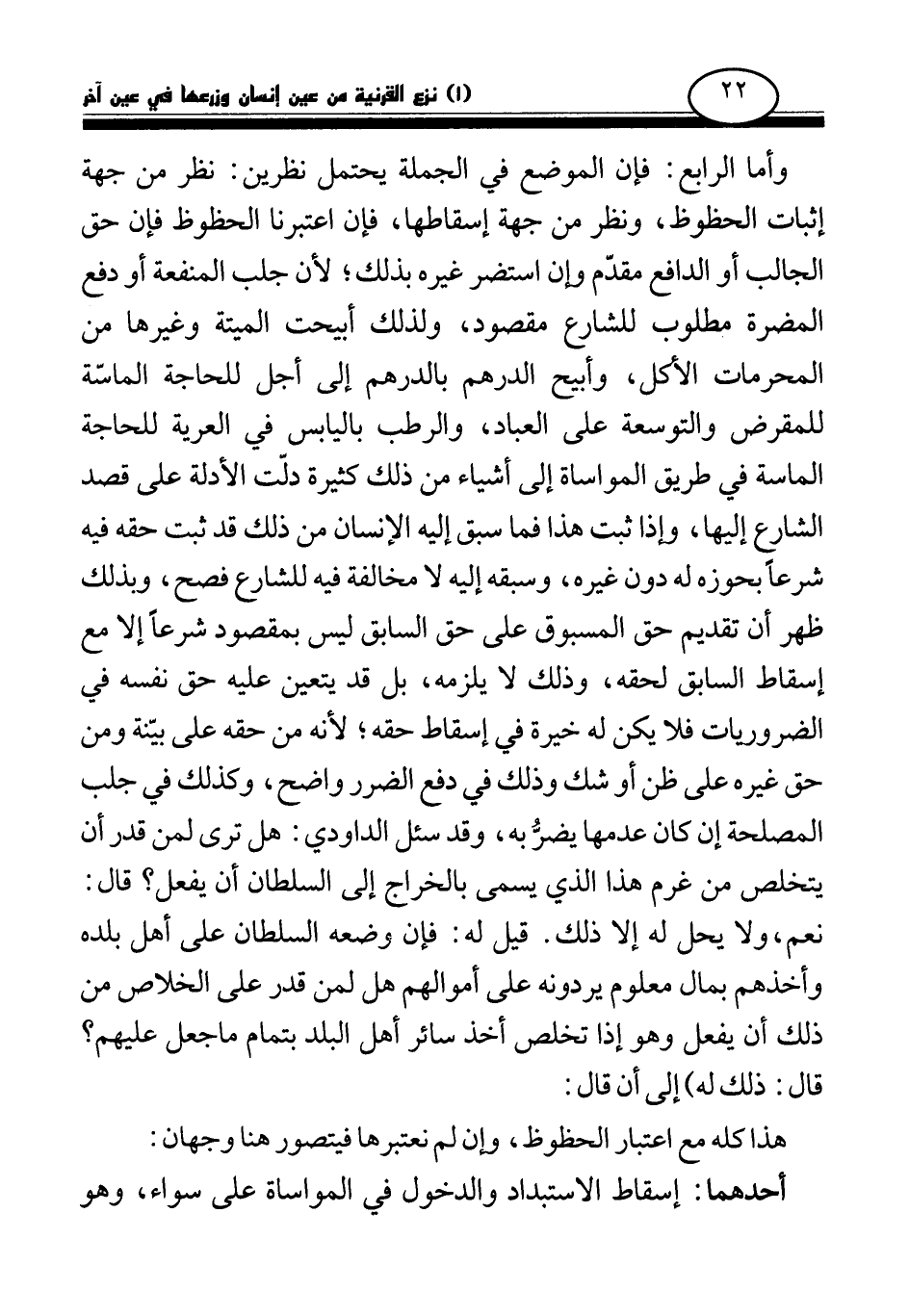 وأما الرابع: فإن الموضع في الجملة يحتمل نظرين: نظر من جهة إثبات الحظوظ، ونظر من جهة إسقاطها، فإن اعتبرنا الحظوظ فإن حق الجالب أو الدافع مقدم إن استضر غيره بذلك؛ لأن جلب المنفعة أو دفع المضرة مطلوب للشارع مقصود، ولذلك أبيحت الميتة وغيرها من المحرمات الأكل، وأبيح الدرهم بالدرهم إلى أجل للحاجة الماسة للمقرض والتوسعة على العباد، والرطب باليابس في العرية للحاجة الماسة في طريق المواساة إلى أشياء من ذلك كثيرة دلت الأدلة على قصد الشارع إليها، وإذا ثبت هذا فما سبق إليه الإنسان من ذلك قد ثبت حقه فيه شرعا بحوزه له دون غيره، وسبقه إليه لا مخالفة فيه للشارع فصح، وبذلك ظهر أن تقديم حق المسبوق على حق السابق ليس بمقصود شرعا إلا مع إسقاط السابق لحقه، وذلك لا يلزمه، بل قد يتعين عليه حق نفسه في الضروريات فلا يكن له خيرة في إسقاط حقه؛ لأنه من حقه على بينة ومن حق غيره على ظن أو شك وذلك في دفع الضرر واضح، وكذلك في جلب المصلحة إن كان عدمها يضر به، وقد سئل الداودي: هل ترى لمن قدر أن يتخلص من غرم هذا الذي يسمى بالخراج إلى السلطان أن يفعل؟ قال: نعم، ولا يحل له إلا ذلك. قيل له: فإن وضعه السلطان على أهل بلده وأخذهم بمال معلوم يردونه على أموالهم هل لمن قدر على الخلاص من ذلك أن يفعل وهو إذا تخلص أخذ سائر أهل البلد بتمام ما جعل عليهم؟ قال: ذلك له) إلى أن قال: