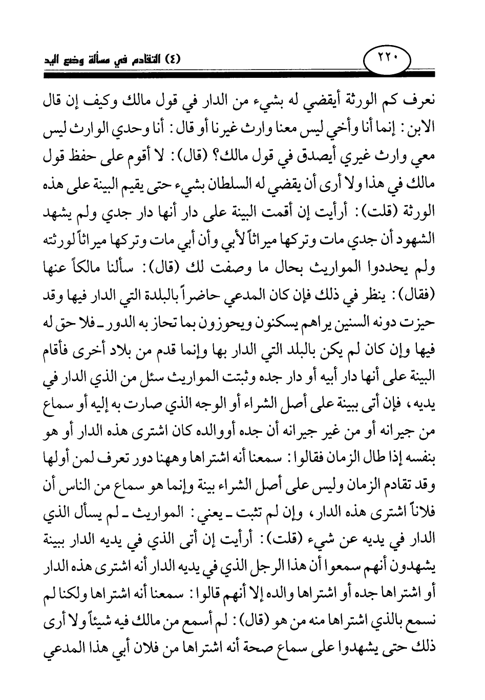 نعرف كم الورثة أيقضي له بشيء من الدار في قول مالك، وكيف إن قال الابن: إنما أنا وأخي ليس معنا وارث غيرنا أو قال: أنا وحدي الوارث ليس معي وارث غير أيصدق في قول مالك؟ (قال) : لا أقوم على حفظ قول مالك في هذا، ولا أرى أن يقضي له السلطان بشيء حتى يقيم البينة على هذه الورثة. (قلت) : أرأيت إن أقمت البينة على دار أنها دار جدي ولم يشهد الشهود أن جدي مات وتركها ميراثا لأبي، وأن أبي مات وتركها ميراثا لورثته ولم يحددوا المواريث بحال ما وصفت لك (قال) : سألنا مالكا عنها (فقال) : ينظر في ذلك فإن كان المدعي حاضرا بالبلدة التي الدار فيها وقد حيزت دونه السنين يراهم يسكنون ويحوزون بما تحاز به الدور -فلا حق له فيها وإن كان لم يكن بالبلد التي الدار بها وإنما قدم من بلاد أخرى فأقام البينة على أنها دار أبيه أو دار جده وثبتت المواريث سئل من الذي الدار في يديه، فإن أتى ببينة على أصل الشراء أو الوجه الذي صارت به إليه أو سماع من جيرانه أو من غير جيرانه أن جده أو والده كان اشترى هذه الدار أو هو بنفسه إذا طال الزمان فقالوا: سمعنا أنه اشتراها وهاهنا دور تعرف لمن أولها وقد تقادم الزمان وليس على أصل الشراء بينة وإنما هو سماع من الناس أن فلانا اشترى هذه الدار، وإن لم تثبت - يعني: المواريث - لم يسأل الذي الدار في يديه عن شيء (قلت) : أرأيت إن أتى الذي في يديه الدار ببينة يشهدون أنهم سمعوا أن هذا الرجل الذي في يديه الدار أنه اشترى هذه الدار أو اشتراها جده أو اشتراها والده إلا أنهم قالوا: سمعنا أنه اشتراها ولكنا لم نسمع بالذي اشتراها منه من هو (قال) : لم أسمع من مالك فيه شيئا ولا أرى ذلك حتى يشهدوا على سماع صحة أنه اشتراها من فلان أبي هذا المدعي