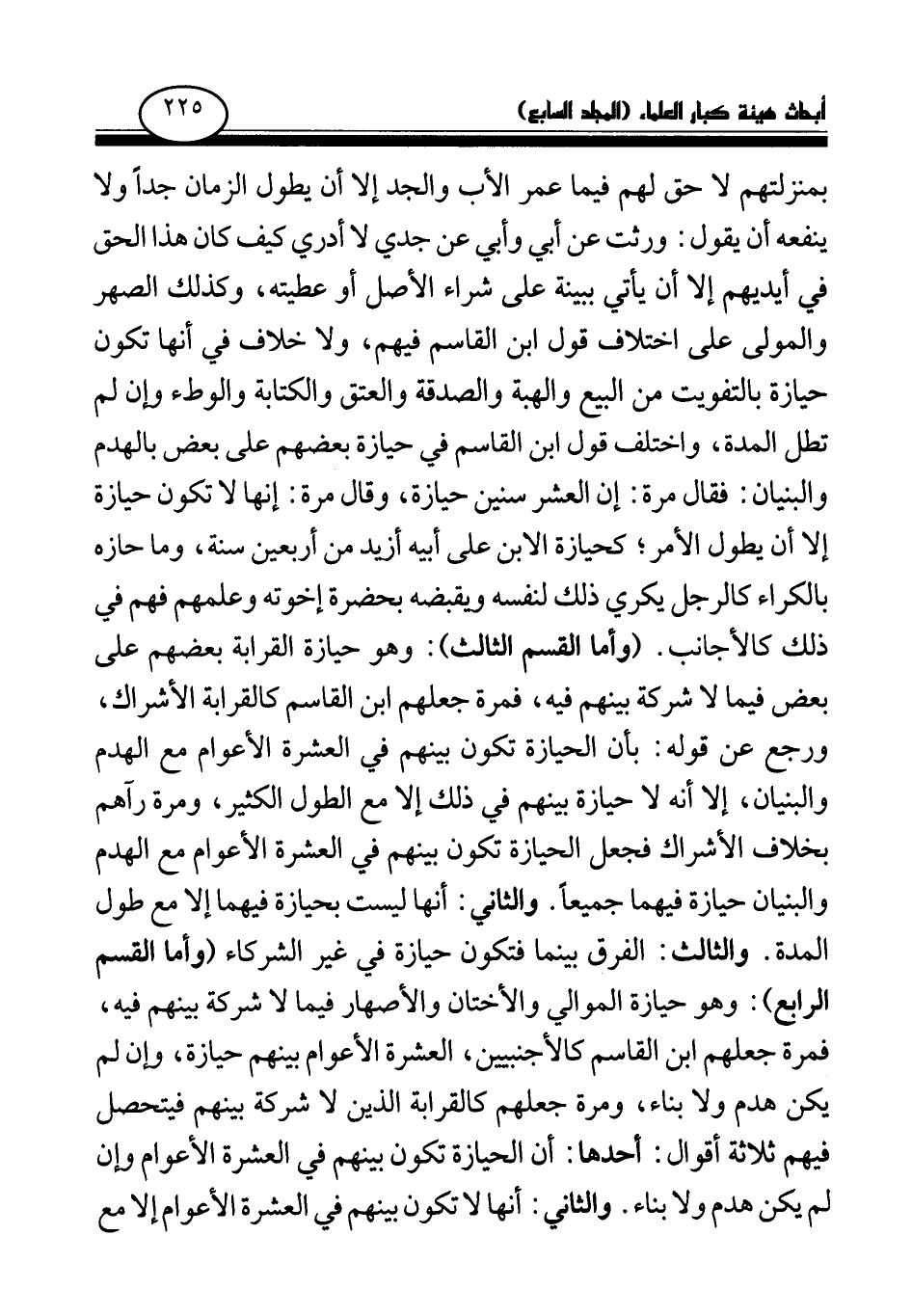 (وأما القسم الثالث) : وهو حيازة القرابة بعضهم على بعض فيما لا شركة بينهم فيه، فمرة جعلهم ابن القاسم كالقرابة الأشراك، ورجع عن قوله بأن الحيازة تكون بينهم في العشرة الأعوام مع الهدم والبنيان، إلا أنه لا حيازة بينهم في ذلك إلا مع الطول الكثير، ومرة رآهم بخلاف الأشراك فجعل الحيازة تكون بينهم في العشرة الأعوام مع الهدم والبنيان حيازة فيهما جميعا.