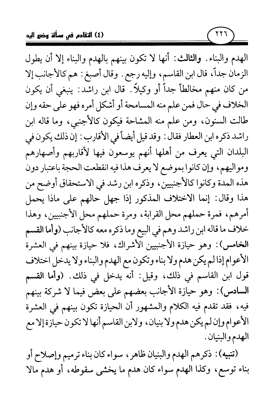 والثالث: أنها لا تكون بينهم بالهدم والبناء إلا أن يطول الزمان جدا. قال ابن القاسم، وإليه رجع. وقال أصبغ: هم كالأجانب إلا من كان منهم مخالطا جدا أو وكيلا. قال ابن رشد: ينبغي أن يكون الخلاف في حال فمن علم منه المسامحة أو أشكل أمره فهو على حقه وإن طالت السنون، ومن علم منه المشاحة فيكون كالأجنبي، وما قاله ابن رشد ذكره ابن العطار فقال: وقد قيل أيضا في الأقارب: إن ذلك يكون في البلدان التي يعرف من أهلها أنهم يوسعون فيها لأقاربهم وأصهارهم ومواليهم، وإن كانوا بموضع لا يعرف هذا فيه انقطعت الحجة باعتبار دون هذه المدة وكانوا كالأجنبيين، وذكره ابن رشد في الاستحقاق أوضح من هذا، وقال: إنما الاختلاف المذكور إذا جهل حالهم على ماذا يحمل أمرهم، فمرة حملهم محل القرابة، ومرة حملهم محل الأجنبيين، وهذا خلاف ما قاله ابن راشد وهم في البيع وما ذكره معه كالأجانب.