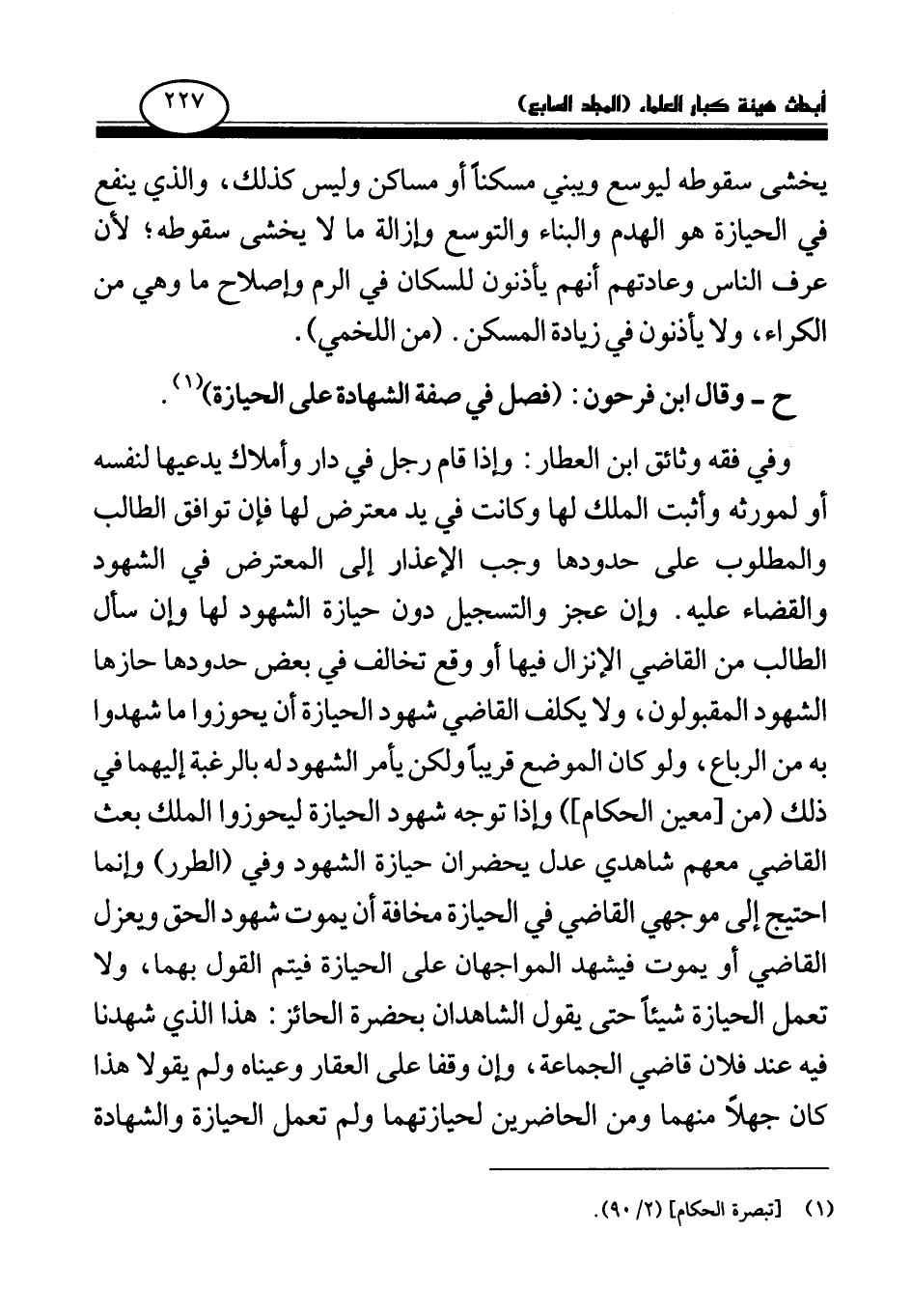 ح- وقال ابن فرحون: (فصل في صفة الشهادة على الحيازة) (¬1) .