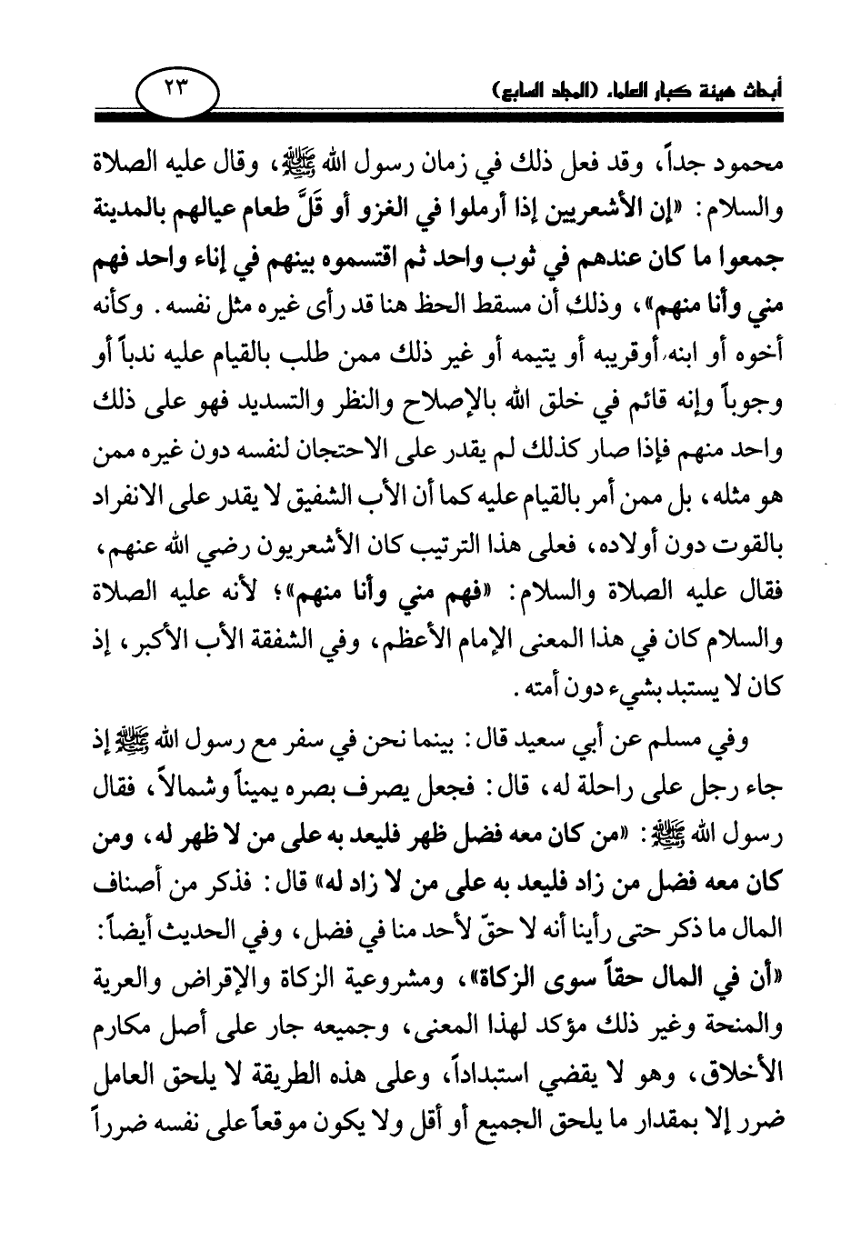 وفي مسلم عن أبي سعيد قال: بينما نحن في سفر مع رسول الله صلى الله عليه وسلم إذ جاء رجل على راحلة له، قال: فجعل يصرف بصره يمينا وشمالا، فقال رسول الله صلى الله عليه وسلم: «من كان معه فضل ظهر فليعد به على من لا ظهر له، ومن كان معه فضل من زاد فليعد به على من لا زاد له (¬2) » قال: فذكر من أصناف المال ما ذكر حتى رأينا أنه لا حق لأحد منا في فضل، وفي الحديث أيضا: «أن في المال حقا سوى الزكاة (¬3) » ، ومشروعية الزكاة والإقراض والعرية والمنحة وغير ذلك مؤكد لهذا المعنى، وجميعه جار على أصل مكارم الأخلاق، وهو لا يقضي استبدادا، وعلى هذه الطريقة لا يلحق العامل ضرر إلا بمقدار ما يلحق الجمع أو أقل ولا يكون موقعا على نفسه ضررا