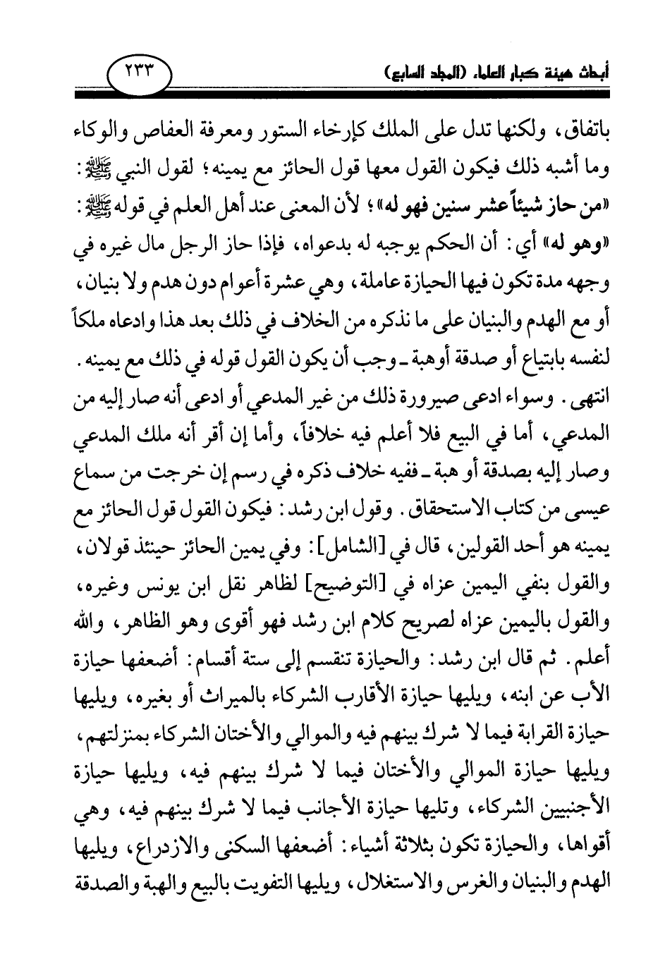ثم قال ابن رشد: والحيازة تنقسم إلى ستة أقسام: أضعفها حيازة الأب عن ابنه، ويليها حيازة الأقارب الشركاء بالميراث أو بغيره، ويليها حيازة القرابة فيما لا شرك بينهم فيه والموالي والأختان الشركاء بمنزلتهم، ويليها حيازة الموالي والأختان فيما لا شرك بينهم فيه، ويليها حيازة الأجنبيين الشركاء، وتليها حيازة الأجانب فيما لا شرك بينهم فيه، وهي أقواها، والحيازة تكون بثلاثة أشياء: أضعفها السكنى والازدراع، ويليها الهدم والبنيان والغرس والاستغلال، ويليها التفويت بالبيع والهبة والصدقة