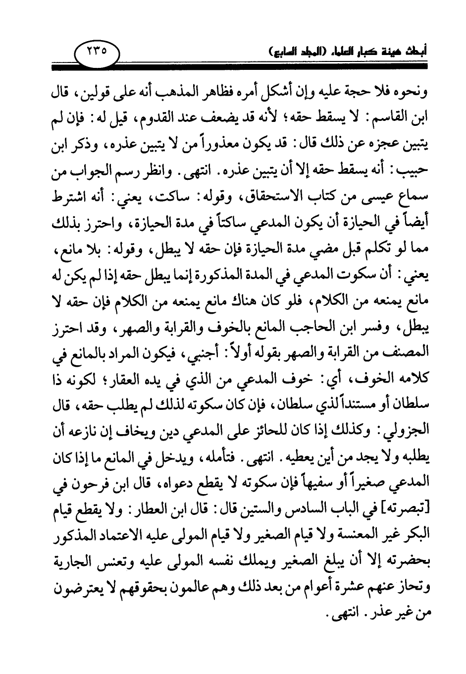 وانظر رسم الجواب من سماع عيسى من كتاب الاستحقاق، وقوله: ساكت، يعني: أنه اشترط أيضا في الحيازة أن يكون المدعي ساكتا في مدة الحيازة، واحترز بذلك مما لو تكلم قبل مضي مدة الحيازة فإن حقه لا يبطل، وقوله: بلا مانع، يعني: أن سكوت المدعي في المدة المذكورة إنما يبطل حقه إذا لم يكن له مانع يمنعه من الكلام، فلو كان هناك مانع يمنعه من الكلام فإن حقه لا يبطل، وفسر ابن الحاجب المانع بالخوف والقرابة والصهر، وقد احترز المصنف من القرابة والصهر بقوله أولا: أجنبي، فيكون المراد بالمانع في كلامه الخوف، أي: خوف المدعي من الذي في يده العقار؛ لكونه ذا سلطان أو مستندا لذي سلطان، فإن كان سكوته لذلك لم يطلب حقه، قال الجزولي: وكذلك إذا كان للحائز على المدعي دين ويخاف إن نازعه أن يطلبه ولا يجد من أين يعطيه. انتهى. فتأمله، ويدخل في المانع ما إذا كان المدعي صغيرا أو سفيها فإن سكوته لا يقطع دعواه، قال ابن فرحون في [تبصرته] في الباب السادس والستين قال: قال ابن العطار: ولا يقطع قيام البكر غير المعنسة ولا قيام الصغير ولا قيام المولى عليه الاعتماد المذكور بحضرته إلا أن يبلغ الصغير ويملك نفسه المولى عليه وتعنس الجارية وتحاز عنهم عشرة أعوام من بعد ذلك وهم عالمون بحقوقهم لا يعترضون من غير عذر. انتهى.
