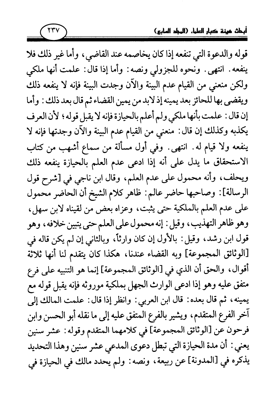 وفي أول مسألة من سماع أشهب من كتاب الاستحقاق ما يدل على أنه إذا ادعى عدم العلم بالحيازة ينفعه ذلك ويحلف، وأنه محمول على عدم العلم، وقال ابن ناجي في [شرح قول الرسالة] : وصاحبها حاضر عالم: ظاهر كلام الشيخ أن الحاضر محمول على عدم العلم بالملكية حتى يثبت، وعزاه بعض من لقيناه لابن سهل، وهو ظاهر التهذيب، وقيل: إنه محمول على العلم حتى يتبين خلافه، وهو قول ابن رشد، وقيل: بالأول إن كان وارثا، وبالثاني إن لم يكن قاله في [الوثائق المجموعة] وبه القضاء عندنا، هكذا كان يتقدم لنا أنها ثلاثة أقوال، والحق أن الذي في [الوثائق المجموعة] إنما هو التنبيه على فرع متفق عليه وهو إذا ادعى الوارث الجهل بملكية موروثه فإنه يقبل قوله مع يمينه، ثم قال بعده: قال ابن العربي: وانظر إذا قال: علمت المالك إلى آخر الفرع المتقدم، ويشير بالفرع المتفق عليه إلى ما نقله أبو الحسن وابن فرحون عن [الوثائق المجموعة] في كلامهما المتقدم وقوله: عشر سنين يعني: أن مدة الحيازة التي تبطل دعوى المدعي عشر سنين، وهذا التحديد يذكره في [المدونة] عن ربيعة، ونصه: ولم يحدد مالك في الحيازة في