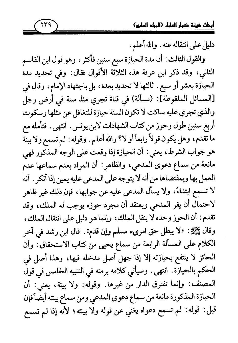 والقول الثالث: أن مدة الحيازة سبع سنين فأكثر، وهو قول ابن القاسم الثاني، وقد ذكر ابن عرفة هذه الثلاثة الأقوال فقال: وفي تحديد مدة الحيازة بعشر أو سبع. ثالثها لا تحديد بعدة، بل باجتهاد الإمام، وقال في [المسائل الملقوطة] : (مسألة) في قناة تجري منذ سنة في أرض رجل والذي تجري عليه ساكت لا تكون السنة حيازة للتغافل عن مثلها وسكوت أربع سنين طول وحوز من كتاب الشهادات لابن يونس. انتهى. فتأمله مع ما تقدم، وهل يكون قولا رابعا أو لا؟ والله أعلم.
