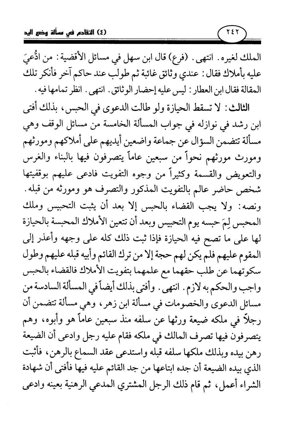 الثالث: لا تسقط الحيازة ولو طالت الدعوى في الحبس، بذلك أفتى ابن رشد في نوازله في جواب المسألة الخامسة من مسائل الوقف وهي مسألة تتضمن السؤال عن جماعة واضعين أيديهم على أملاكهم ومورثهم ومورث مورثهم نحوا من سبعين عاما يتصرفون فيها بالبناء والغرس والتعويض والقسمة وكثيرا من وجوه التفويت فادعى عليهم بوقفيتها شخص حاضر عالم بالتفويت المذكور والتصرف هو ومورثه من قبله.