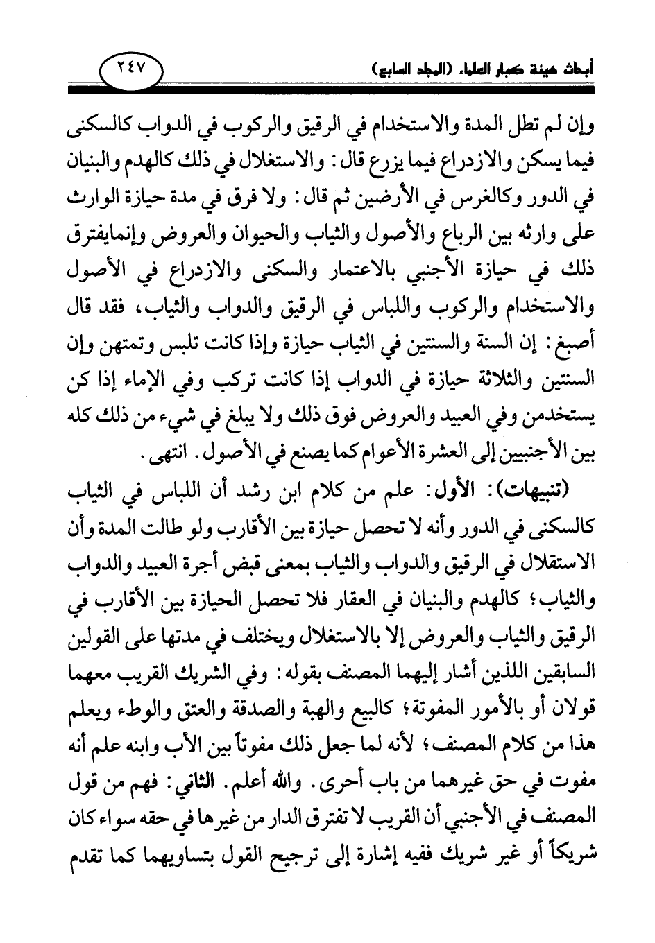 وإن لم تطل المدة والاستخدام في الرقيق والركوب في الدواب كالسكنى فيما يسكن والازدراع فيما يزرع قال: والاستغلال في ذلك كالهدم والبنيان في الدور وكالغرس في الأرضين ثم قال: ولا فرق في مدة حيازة الوارث على وارثه بين الرباع والأصول والثياب والحيوان والعروض وإنما يفترق ذلك في حيازة الأجنبي بالاعتمار والسكنى والازدراع في الأصول والاستخدام والركوب واللباس في الرقيق والدواب والثياب، فقد قال أصبغ: إن السنة والسنتين في الثياب حيازة وإذا كانت تلبس وتمتهن، وإن السنتين والثلاثة حيازة في الدواب إذا كانت تركب، وفي الإماء إذا كن يستخدمن، وفي العبيد والعروض فوق ذلك، ولا يبلغ في شيء من ذلك كله بين الأجنبيين إلى العشرة الأعوام كما يصنع في الأصول. انتهى.