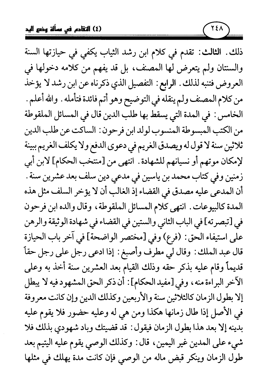 الخامس: في المدة التي يسقط بها طلب الدين قال في المسائل الملقوطة من الكتب المبسوطة المنسوب لولد ابن فرحون: الساكت عن طلب الدين ثلاثين سنة لا قول له ويصدق الغريم في دعوى الدفع ولا يكلف الغريم ببينة لا مكان موتهم أو نسيانهم للشهادة. انتهى من [منتخب الحكام] لابن أبي زمنين.