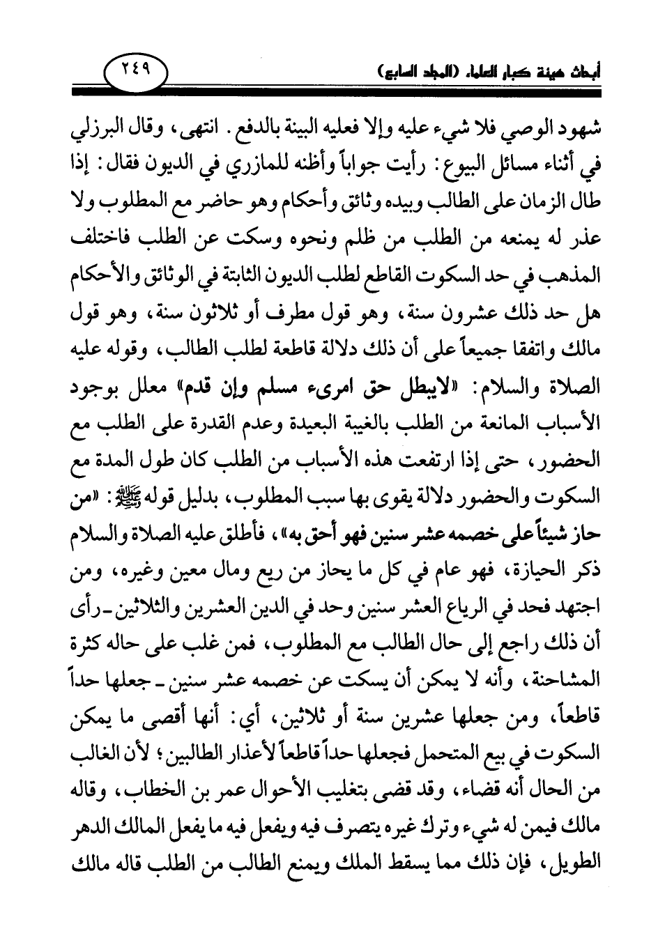 وقال البرزلي في أثناء مسائل البيوع: رأيت جوابا وأظنه للمازري في الديون فقال: إذا طال الزمان على الطالب وبيده وثائق وأحكام وهو حاضر مع المطلوب ولا عذر له يمنعه من الطلب من ظلم ونحوه وسكت عن الطلب فاختلف المذهب في حد السكوت القاطع لطلب الديون الثابتة في الوثائق والأحكام هل حد ذلك عشرون سنة، وهو قول مطرف أو ثلاثون سنة، وهو قول مالك واتفقا جميعا على أن ذلك دلالة قاطعة لطلب الطالب، وقوله عليه الصلاة والسلام: «لا يبطل حق امرئ مسلم وإن قدم» معلل بوجود الأسباب المانعة من الطلب بالغيبة البعيدة وعدم القدرة على الطلب مع الحضور، حتى إذا ارتفعت هذه الأسباب من الطلب كان طول المدة مع السكوت والحضور دلالة يقوى بها سبب المطلوب، بدليل قوله صلى الله عليه وسلم: «من حاز شيئا على خصمه عشر سنين فهو أحق به» ، فأطلق عليه الصلاة والسلام ذكر الحيازة، فهو عام في كل ما يحاز من ريع ومال معين وغيره، ومن اجتهد فحد في الرياع العشر سنين وحد في الدين العشرين والثلاثين - رأى أن ذلك راجع إلى حال الطالب مع المطلوب، فمن غلب على حاله كثرة المشاحنة، وأنه لا يمكن أن يسكت عن خصمه عشر سنين -جعلها حدا قاطعا، ومن جعلها عشرين سنة أو ثلاثين، أي: أنها أقصى ما يمكن السكوت في بيع المتحمل فجعلها حدا قاطعا لأعذار الطالبين؛ لأن الغالب من الحال أنه قضاء، وقد قضى بتغليب الأحوال عمر بن الخطاب، وقاله مالك فيمن له شيء وترك غيره يتصرف فيه ويفعل فيه ما يفعل المالك الدهر الطويل، فإن ذلك مما يسقط الملك ويمنع الطالب من الطلب، قاله مالك