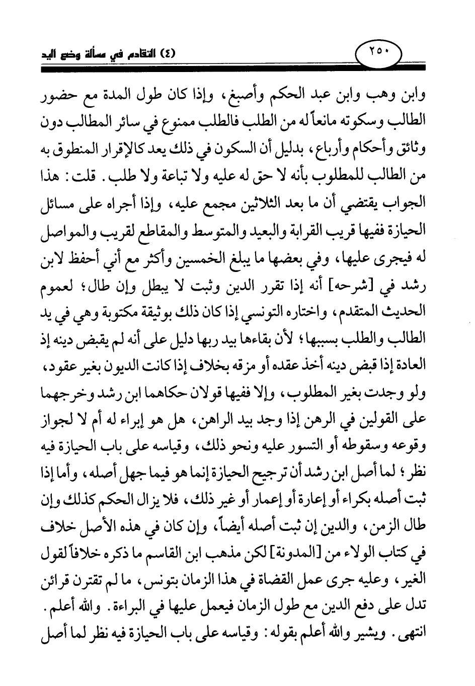 قلت: هذا الجواب يقتضي، أن ما بعد الثلاثين مجمع عليه، وإذا أجراه على مسائل الحيازة ففيها قريب القرابة والبعيد والمتوسط والمقاطع لقريب والمواصل له فيجرى عليها، وفي بعضها ما يبلغ الخمسين وأكثر مع أني أحفظ لابن رشد في [شرحه] أنه إذا تقرر الدين وثبت لا يبطل وإن طال؛ لعموم الحديث المتقدم، واختاره التونسي إذا كان ذلك بوثيقة مكتوبة وهي في يد الطالب والطلب بسببها؛ لأن بقاءها بيد ربها دليل على أنه لم يقبض دينه إذ العادة إذا قبض دينه أخذ عقده أو مزقه بخلاف إذا كانت الديون بغير عقود، ولو وجدت بغير المطلوب، وإلا ففيها قولان حكاهما ابن رشد وخرجهما على القولين في الرهن إذا وجد بيد الراهن، هل هو إبراء له أم لا لجواز وقوعه وسقوطه أو التسور عليه ونحو ذلك، وقياسه على باب الحيازة فيه نظر؛ لما أصل ابن رشد أن ترجيح الحيازة إنما هو فيما جهل أصله، وأما إذا ثبت أصله بكراء أو إعارة أو إعمار أو غير ذلك، فلا يزال الحكم كذلك وإن طال الزمن، والدين إن ثبت أصله أيضا، وإن كان في هذه الأصل خلاف في كتاب الولاء من [المدونة] ، لكن مذهب ابن القاسم ما ذكره خلافا لقول الغير، وعليه جرى عمل القضاة في هذا الزمان بتونس، ما لم تقترن قرائن تدل على دفع الدين مع طول الزمان فيعمل عليها في البراءة. والله أعلم. انتهى.