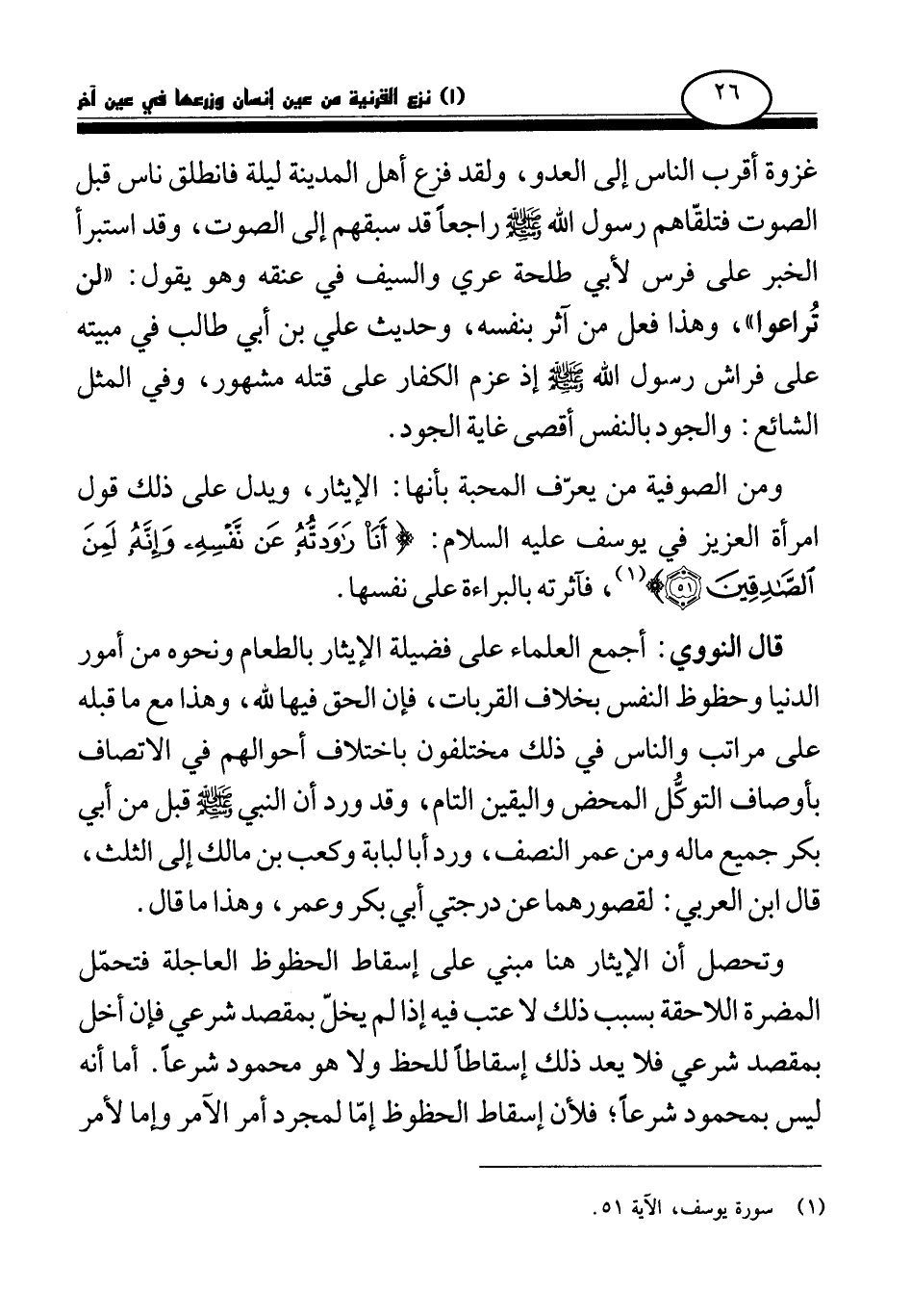 قال النووي: أجمع العلماء على فضيلة الإيثار بالطعام ونحوه من أمور الدنيا وحظوظ النفس بخلاف القربات، فإن الحق فيها لله، وهذا مع ما قبله على مراتب والناس في ذلك مختلفون باختلاف أحوالهم في الاتصاف بأوصاف التوكل المحض واليقين التام، وقد ورد أن النبي صلى الله عليه وسلم قبل من أبي بكر جميع ماله ومن عمر النصف، ورد أبا لبابة وكعب بن مالك إلى الثلث، قال ابن العربي: لقصورهما عن درجتي أبي بكر وعمر، وهذا ما قال.