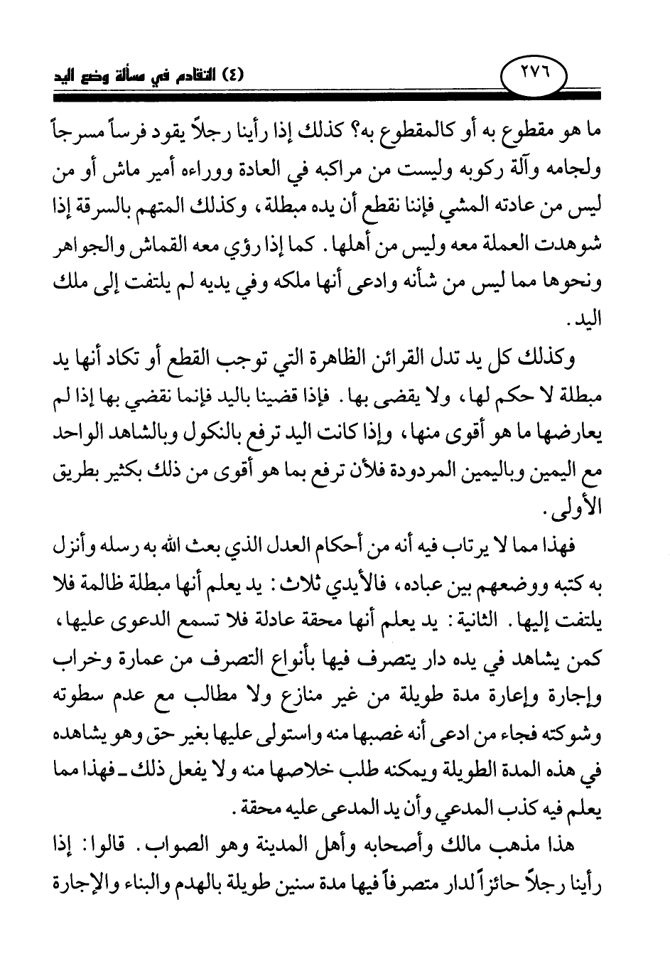 ما هو مقطوع به أو كالمقطوع به؟ كذلك إذا رأينا رجلا يقود فرسا مسرجا ولجامه وآلة ركوبه، وليست من مراكبه في العادة ووراءه أمير ماش أو من ليس من عادته المشي فإننا نقطع أن يده مبطلة، وكذلك المتهم بالسرقة إذا شوهدت العملة معه وليس من أهلها. كما إذا رؤي معه القماش والجواهر ونحوها مما ليس من شأنه، وادعى أنها ملكه وفي يديه لم يلتفت إلى ملك اليد.