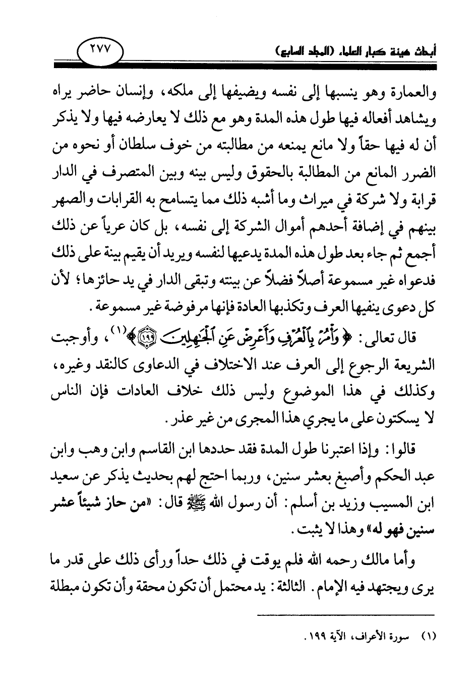 قال تعالى: {وَأْمُرْ بِالْعُرْفِ وَأَعْرِضْ عَنِ الْجَاهِلِينَ} (¬1) وأوجبت الشريعة الرجوع إلى العرف عند الاختلاف في الدعاوى كالنقد وغيره، وكذلك في هذا الموضوع وليس ذلك خلاف العادات فإن الناس لا يسكتون على ما يجري هذا المجرى من غير عذر.