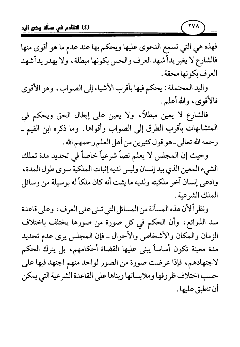 واليد المحتملة: يحكم فيها بأقرب الأشياء إلى الصواب، وهو الأقوى فالأقوى، والله أعلم.
