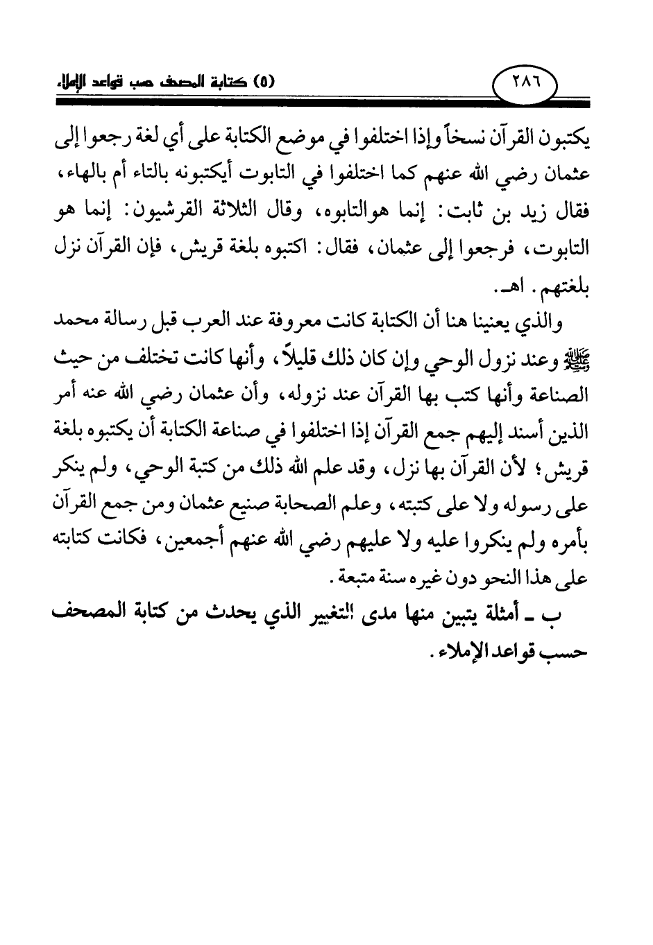 والذي يعنينا هنا أن الكتابة كانت معروفة عند العرب قبل رسالة محمد صلى الله عليه وسلم، وعند نزول الوحي وإن كان ذلك قليلا، وأنها كانت تختلف من حيث الصناعة، وأنها كتب بها القرآن عند نزوله، وأن عثمان رضي الله عنه أمر الذين أسند إليهم جمع القرآن إذا اختلفوا في صناعة الكتابة أن يكتبوه بلغة قريش؛ لأن القرآن بها نزل، وقد علم الله ذلك من كتبة الوحي، ولم ينكر على رسوله ولا على كتبته، وعلم الصحابة صنيع عثمان ومن جمع القرآن بأمره، ولم ينكروا عليه ولا عليهم رضي الله عنهم أجمعين، فكانت كتابته على هذا النحو دون غيره سنة متبعة.